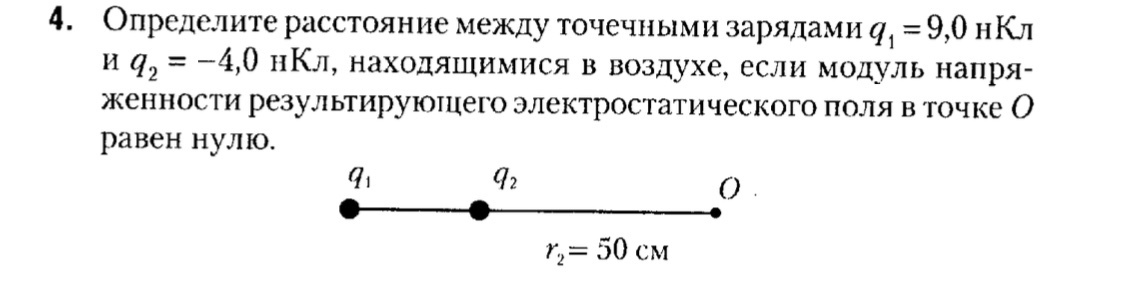 Определите расстояние между Точечными зарядами q1=9нКл и q2=-4нКл,находящимися в воздухе, если модуль напряженности результирующего электростатического поля в точке О равен 0
