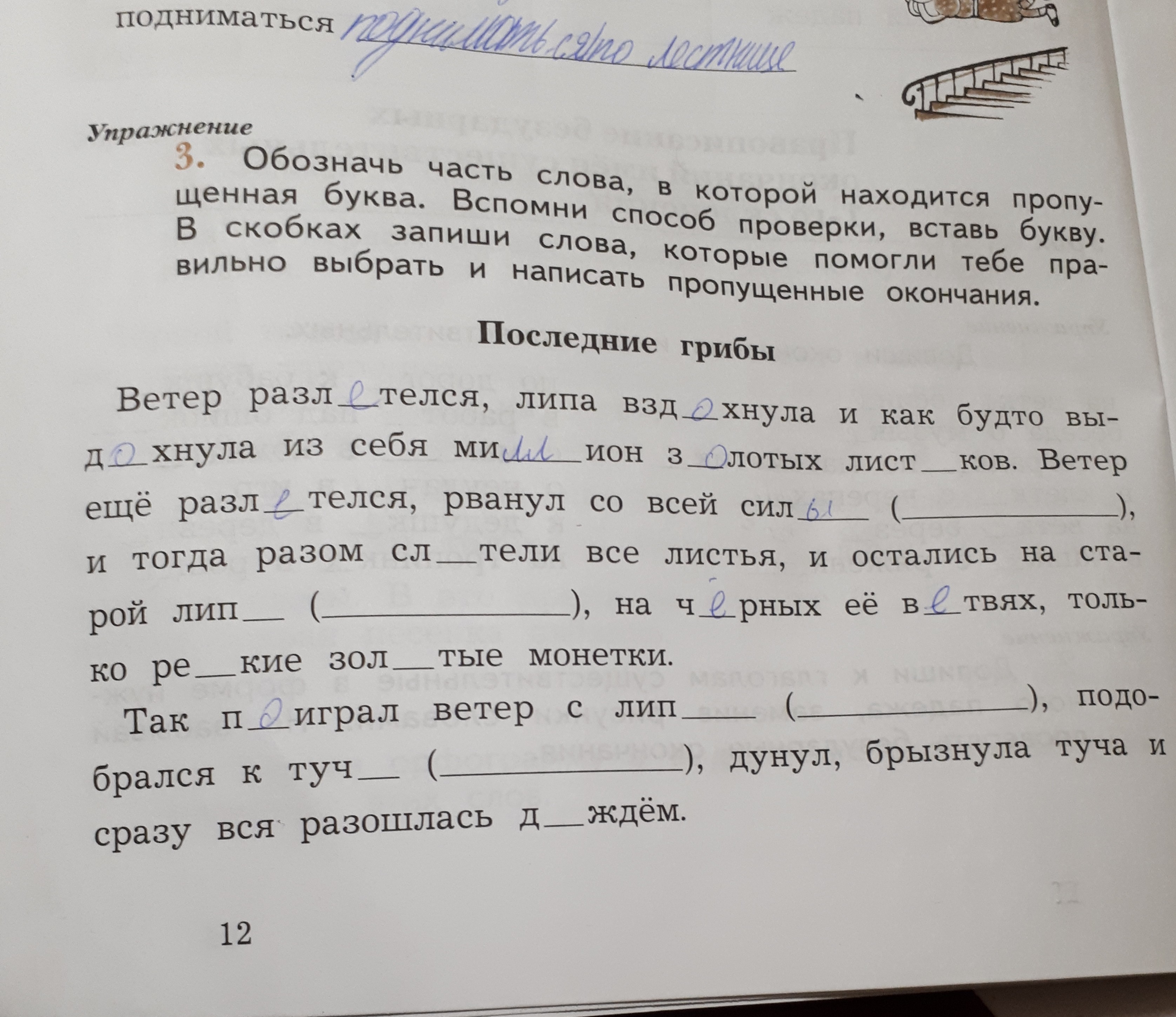 обозначь часть слова в которой находится пропущенная буква Вспомни способ проверки и вставь буквы в скобках Запиши слова которые помогли Тебе правильно выбрать и написать пропущенные окончания