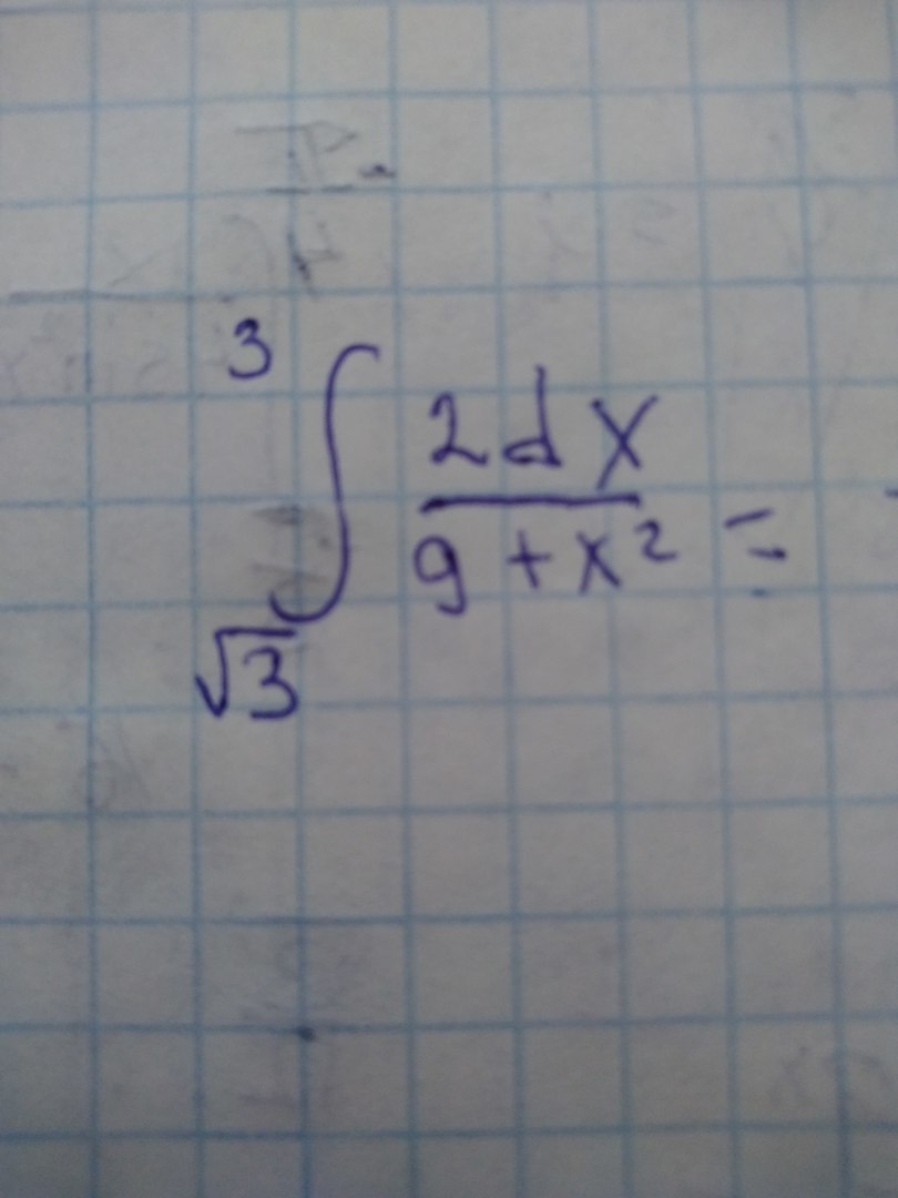 intlimits^3_{sqrt{3}}  { frac{2dx}{9+x^2} }= intlimits^3_{sqrt{3}}  { frac{2dx}{9(1+ frac{x^2}{9})} }=intlimits^3_{sqrt{3}}  { frac{2d( frac{x}{3} )}{3(1+ (frac{x}{3})^2)} }=frac{2}{3} arctg(frac{x}{3})= \\ = (frac{2}{3} arctg(frac{3}{3}))-(frac{2}{3} arctg(frac{ sqrt{3} }{3}))=frac{2}{3}* frac{ pi }{4} -frac{2}{3}* frac{ pi }{6} =frac{ pi }{6} -frac{ pi }{9} = frac{ pi }{18}