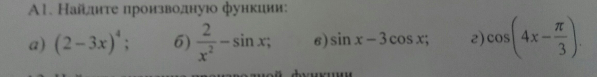 -12(2-3х)^3, - 4х^(-3)- cos(х), cos(х) +3sin(x), - 4sin(4x-p/3)