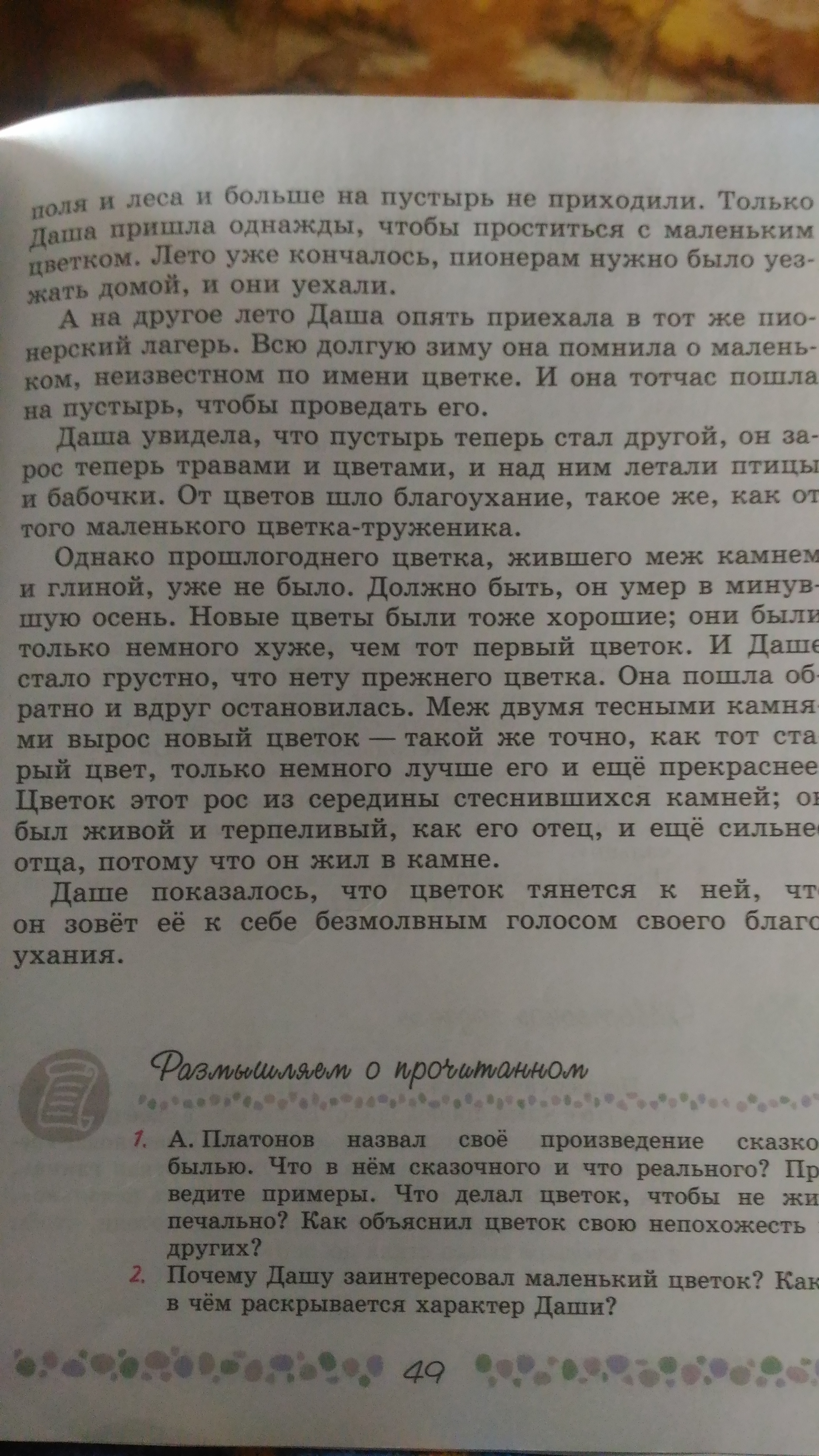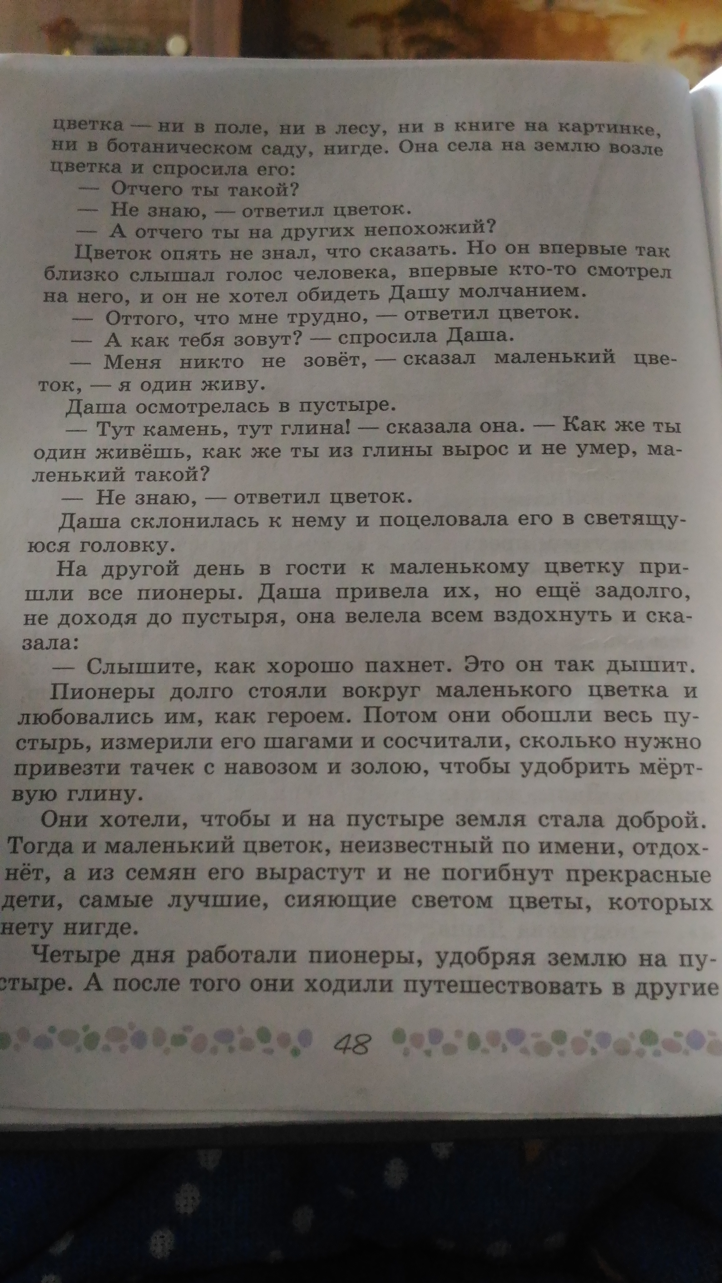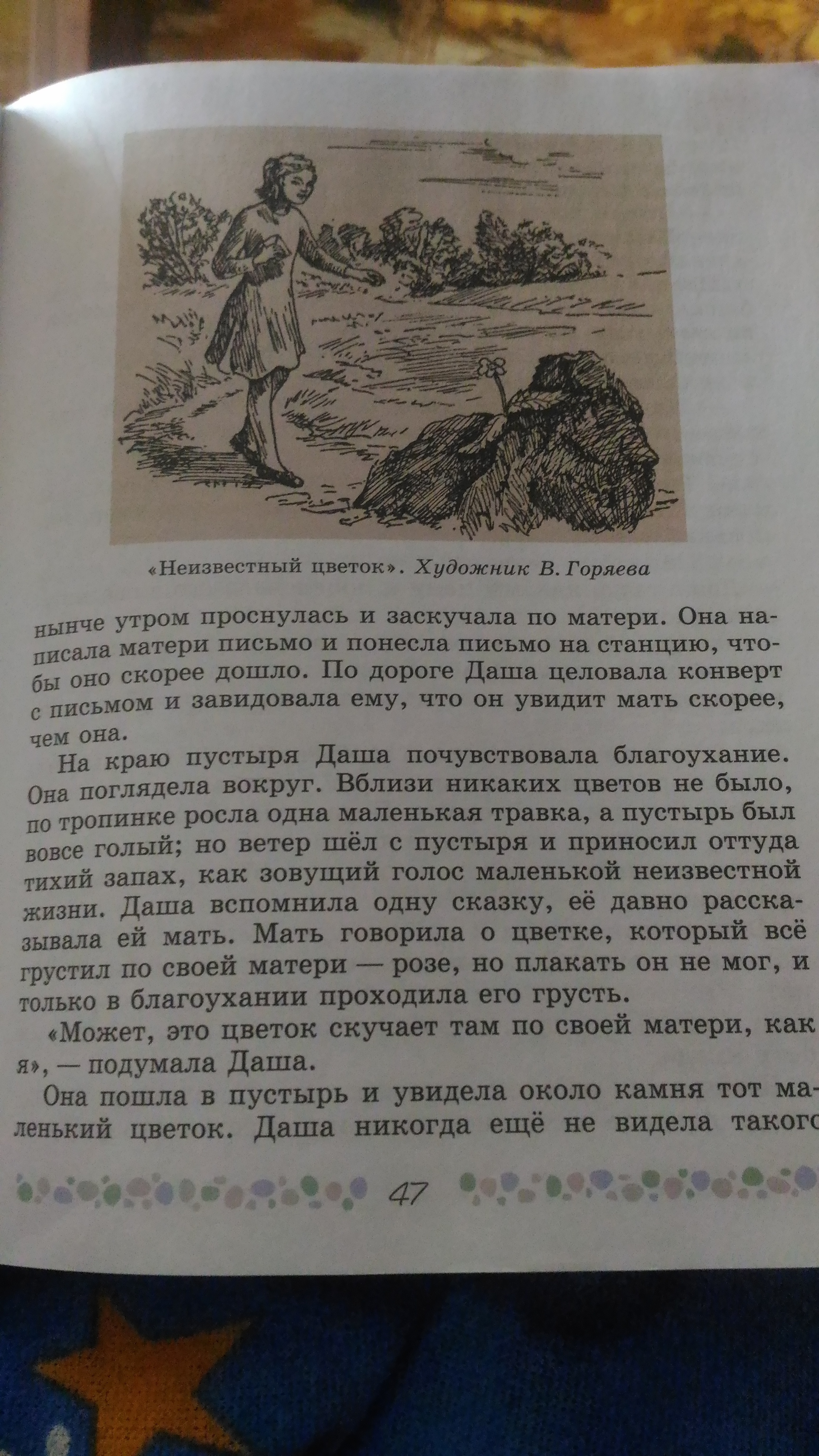 - Какие художественно-выразительные средства описывают неизвестный цветок? (эпитеты: «листья его не могли... стать зелёными: одна жилка у них была синяя, другая красная, третья голубая или золотого цвета», «венчик у него был составлен из лепестков простого светлого цвета, ясного и сильного», «светился живым мерцающим огнем»; сравнение: лепестки, «как у звезды»; метафоры: «выпустило из себя тонкие волоски корешка», «листья тяжелели от росы»; олицетворения: «томилось это семечко», «приютилось оно», «цветок всю ночь сторожил росу и собирал её по каплям», «он трудился день и ночь», «он... превозмогал терпеньем свою боль от голода и усталости», «цветок ...не хотел жить печально», «он дремал» и др.)