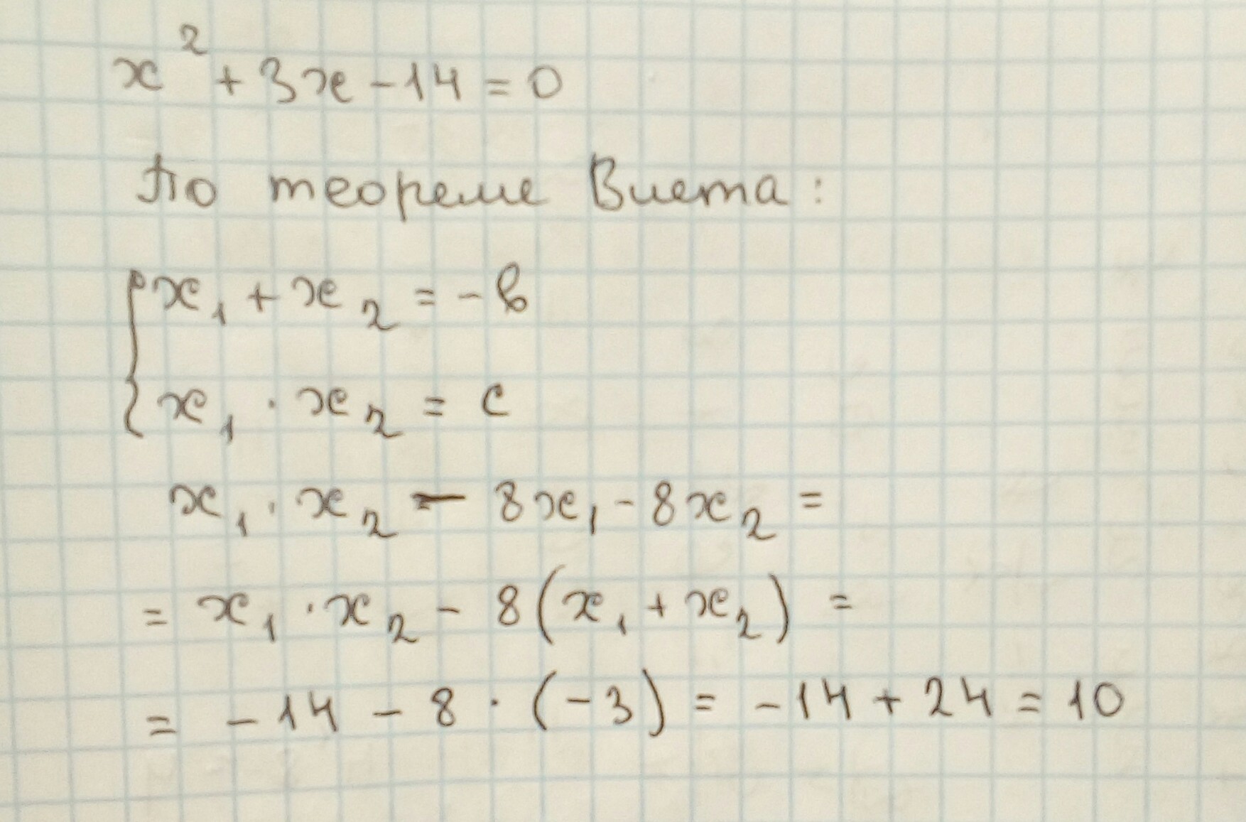 Не вычисляя корней уравнения х²+3х-14=0 найдите значения выражения х1*х2 - 8х1- 8х2, где х1 и х2 - корни данного уравнения.(можно кратно)Очень срочно нужно