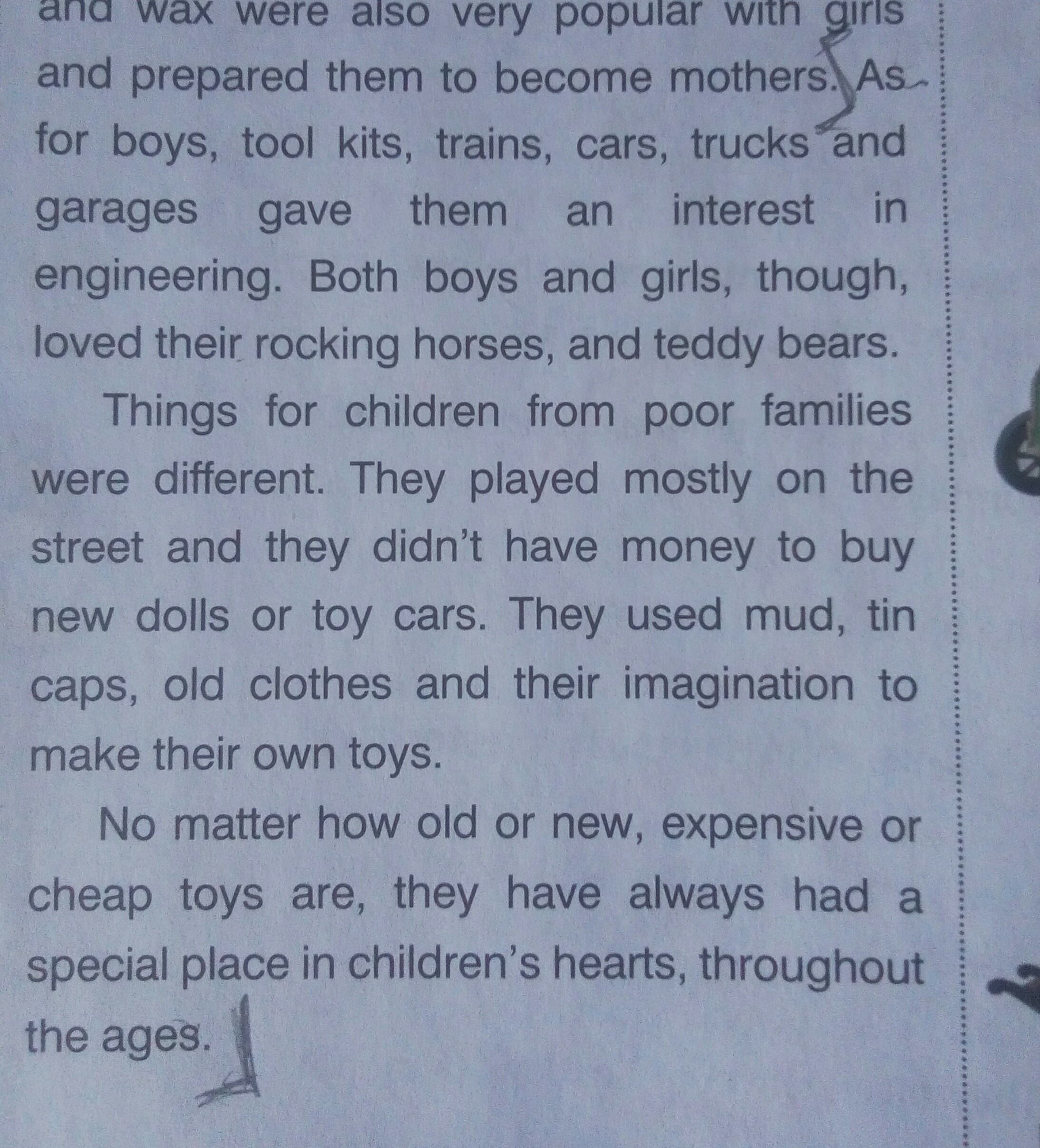 А для мальчиков, наборы инструментов, поезда, автомобили, грузовики и гаражи придавали им интерес к технике. И мальчики, и девочки, однако, любили своих качающихся лошадей и плюшевых медведей. Вещи для детей из бедных семей были разными. Они играли в основном на улице, и у них не было денег на покупку новых кукол или игрушечных автомобилей. Они использовали грязь, оловянные колпаки, старую одежду и свое воображение, чтобы изготовить собственные игрушки. Независимо от того, как старые или новые, дорогие или дешевые игрушки, у них всегда было особое место в детских сердцах, на протяжении веков.
