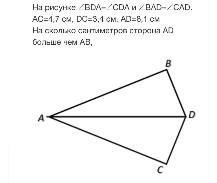 ∠BDA=∠CDA ∠BAD=∠CAD.AC=4,7 см, DC=3,4 см, AD=8,1 см На сколько сантиметров сторона AD больше чем AB,
