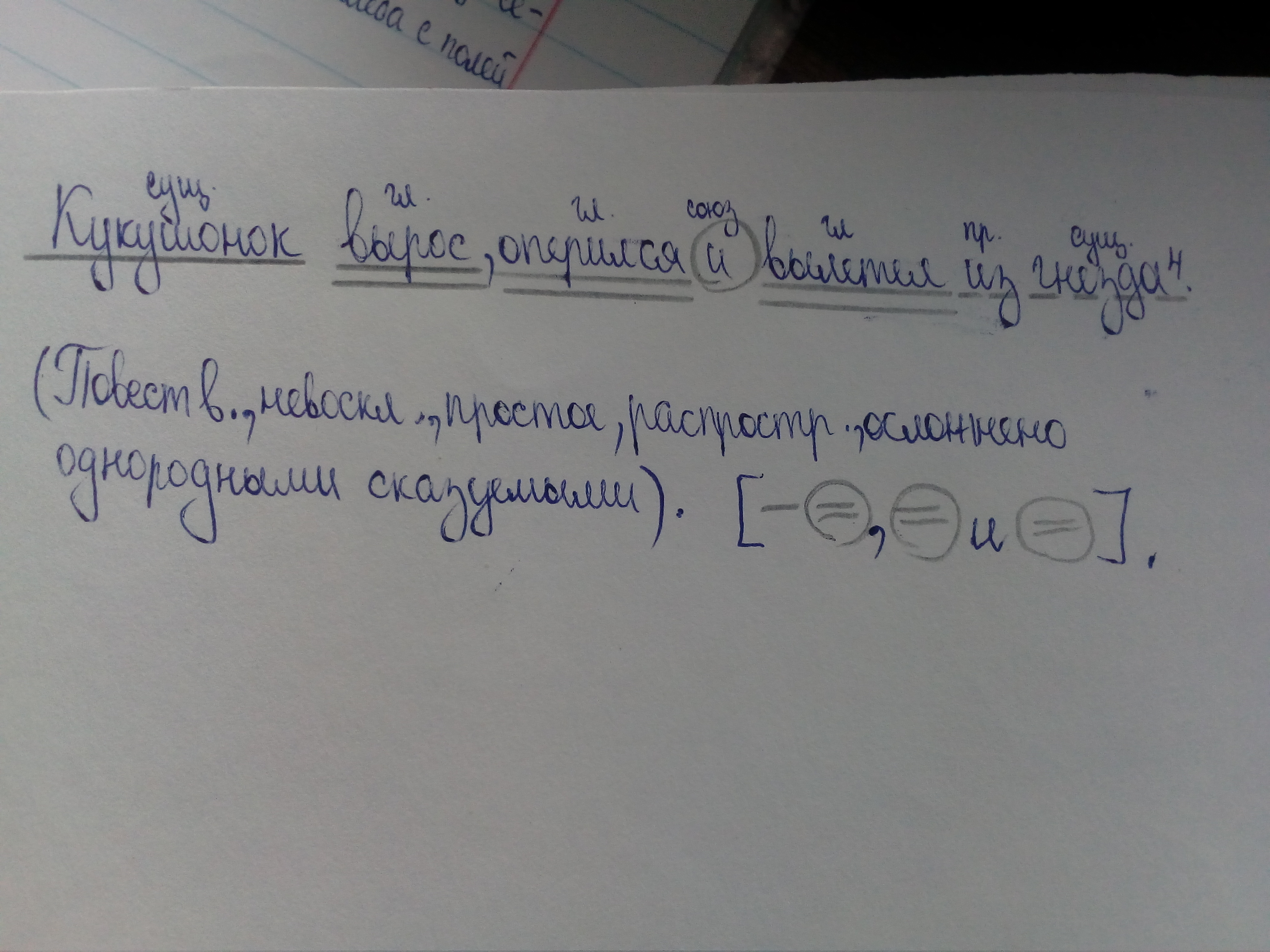 Кукушонок (под. вып. сущ. в И .п.) вырос , оперился и вылетел (однор. сказ. выр. глаг. в из.н.) из гнезда (обст. выр. сущ. с пр. в Р.п)