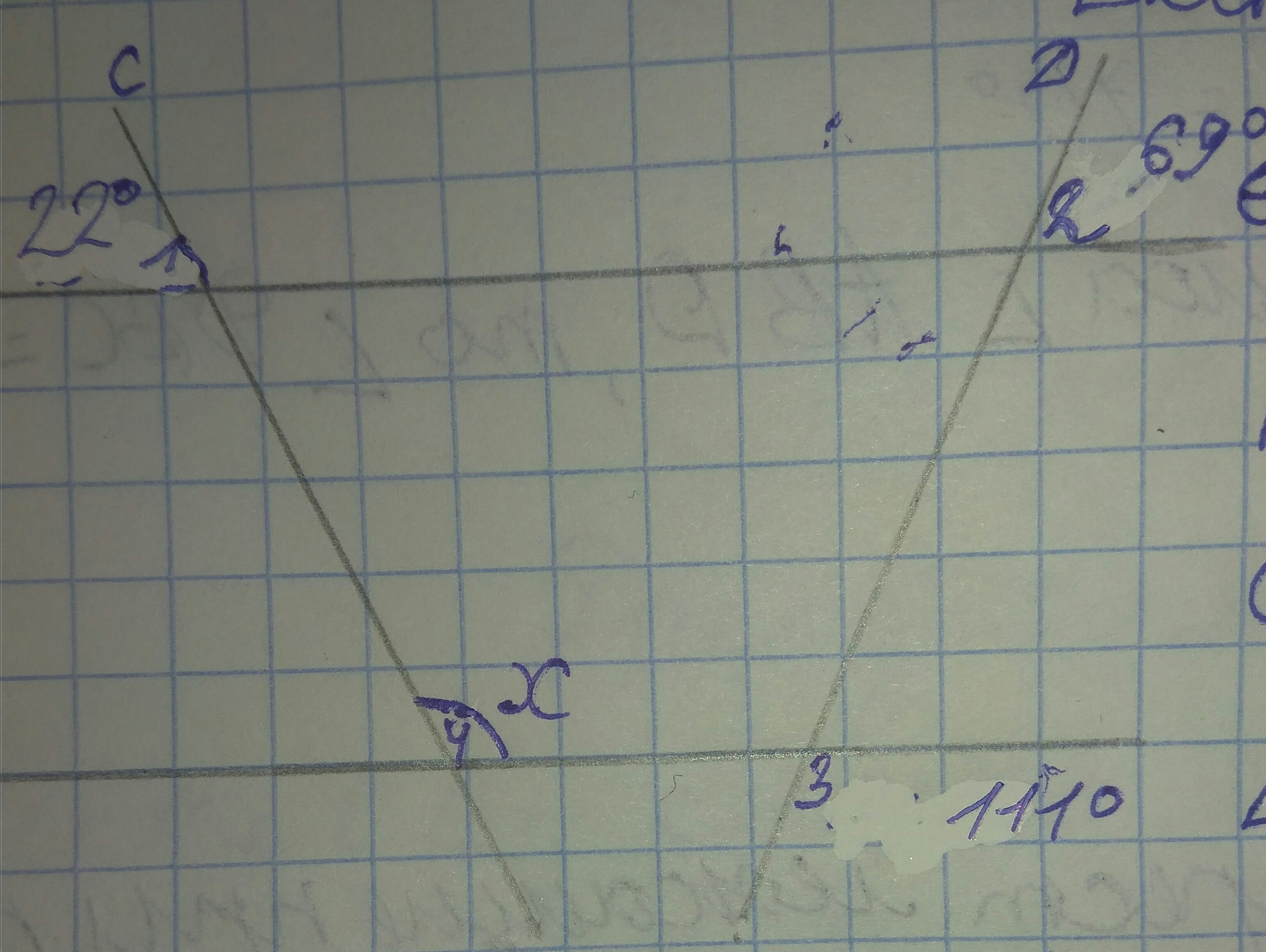 прямая А параллельна б эти прямые пересекают две секущей C и D угол 1 равен 22 градуса угол 2 равен 69 градусов угол 3 равен 111 градусов Чему равен Угол 4