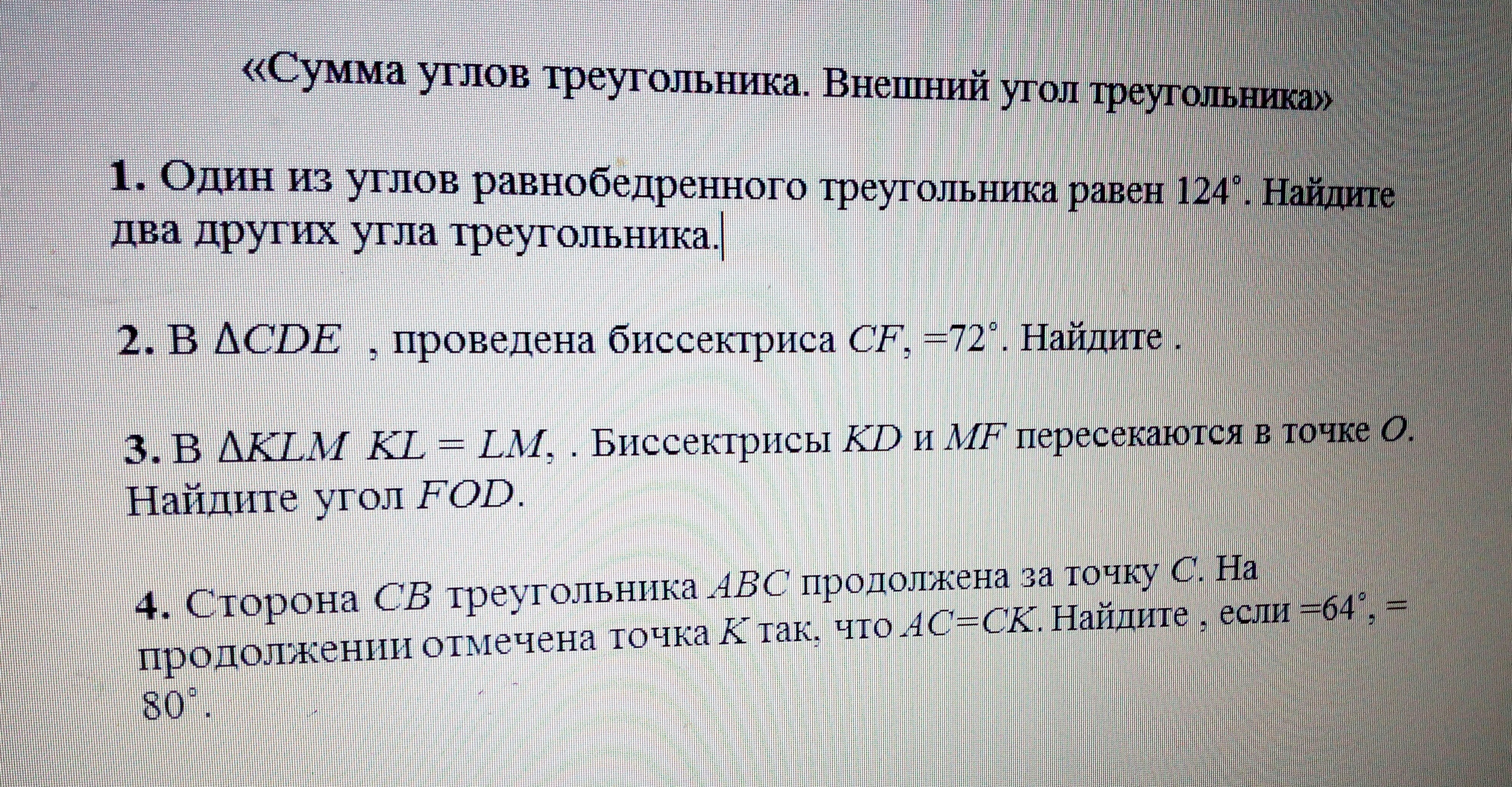 Ясно, что сумма всех углов равна 180°, один из углов равен 124°