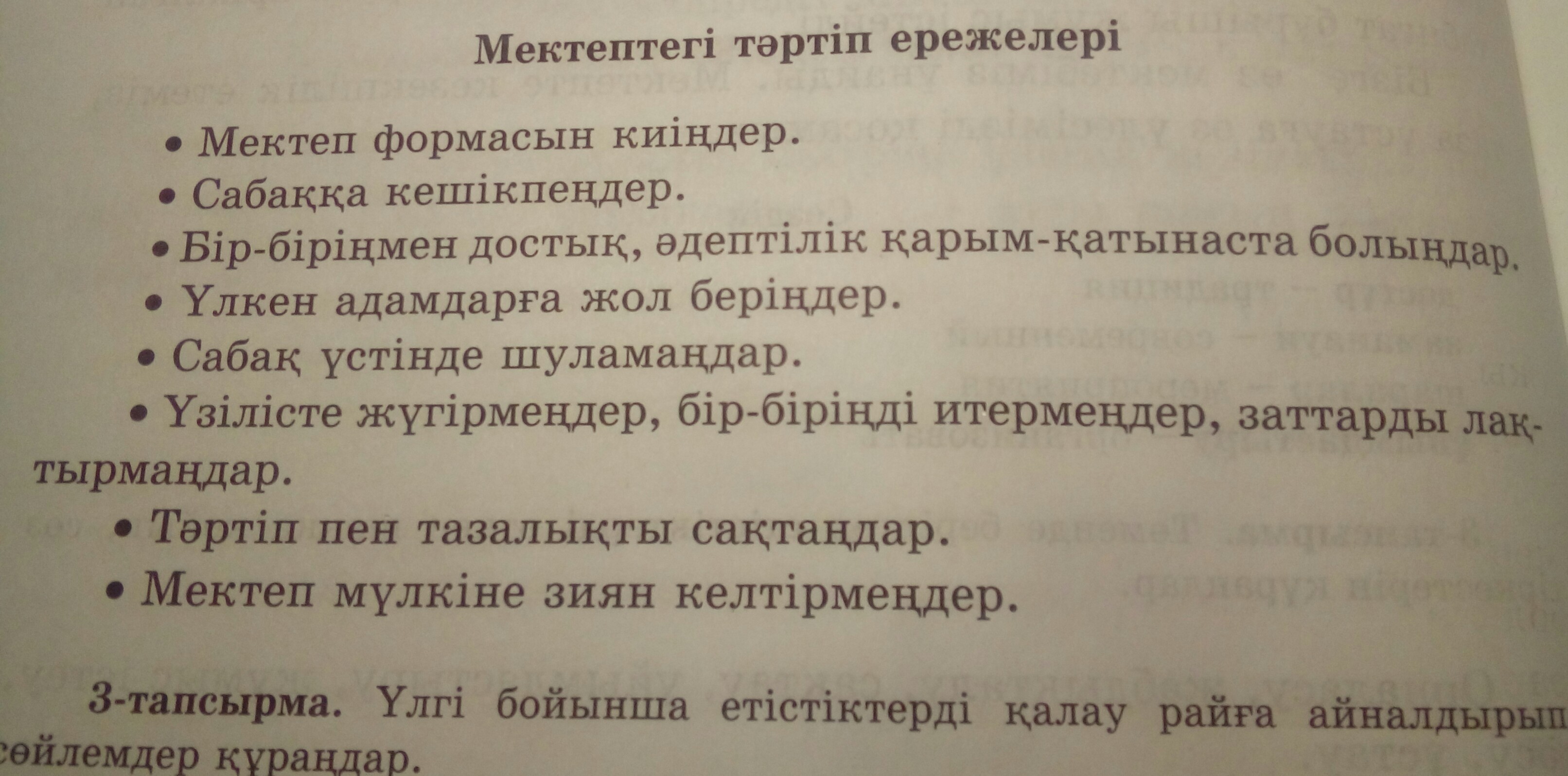 Школьную форму одевайте. На урок не опаздывайте.Друг-другу помогайте , защищайте , не большуюобижайте. Старшим людям дорогу дайте.На уроке не шумите . Пр классу не бегайте , друг -дрга не толкайте, вещи не кидайте . Чистату соблюдайте.Школе зло не делайте