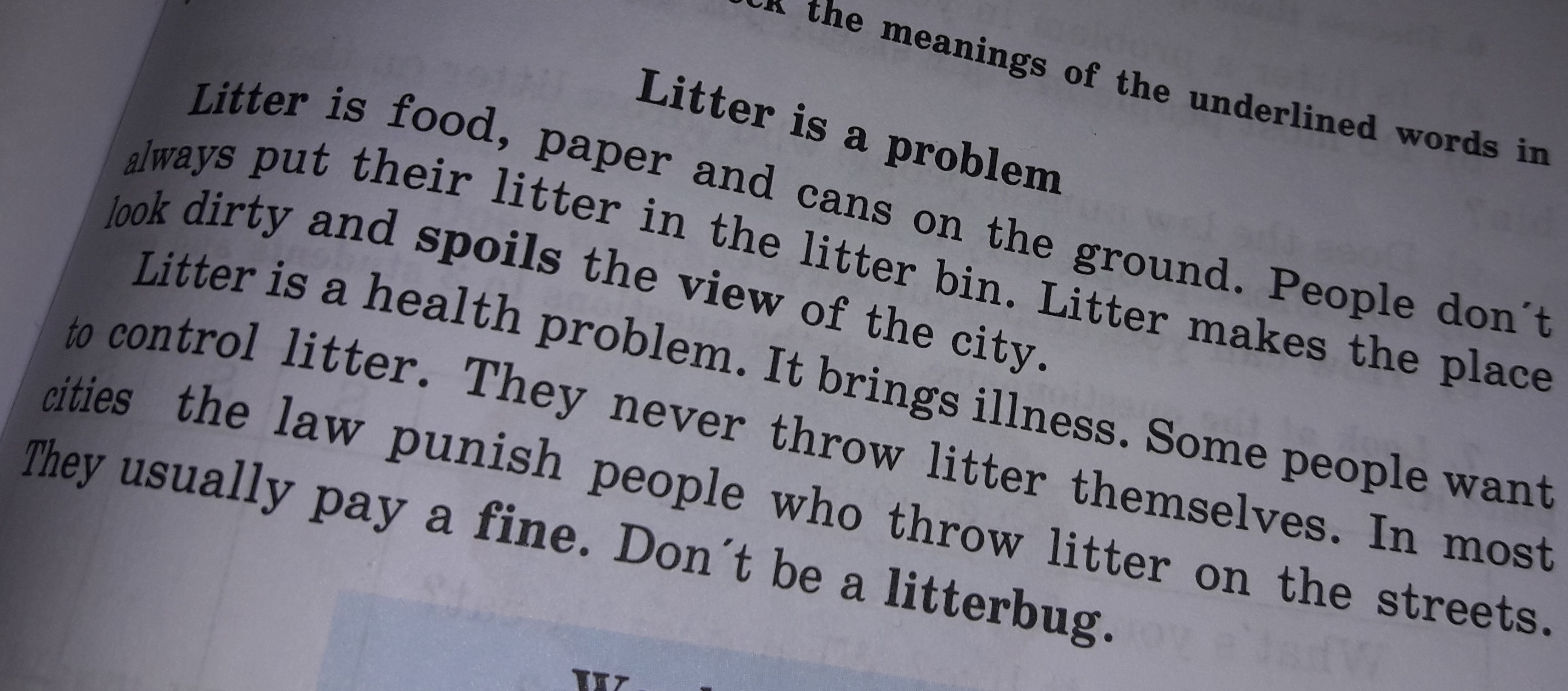 Мусор - это проблема здоровья. Он приносит болезни. Некоторые люди хотят контролировать мусор. Они никогда не бросают мусор самостоятельно. В большинстве городов закон наказывает людей которые бросают мусор на улицах. Они обычно выплачивают штраф. Не мусори на улице!