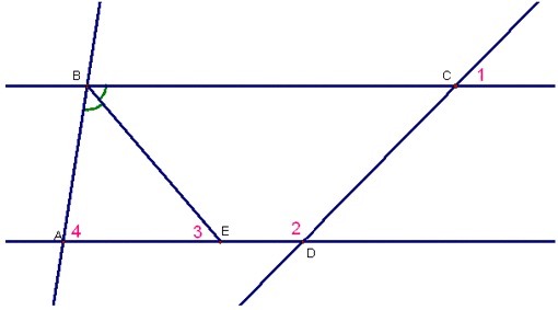 На рисунке;угол 1= 51 угол 2=129 градусов.угол 3=52 градуса,BE-бессектриса угла ABC найдите угол 4
