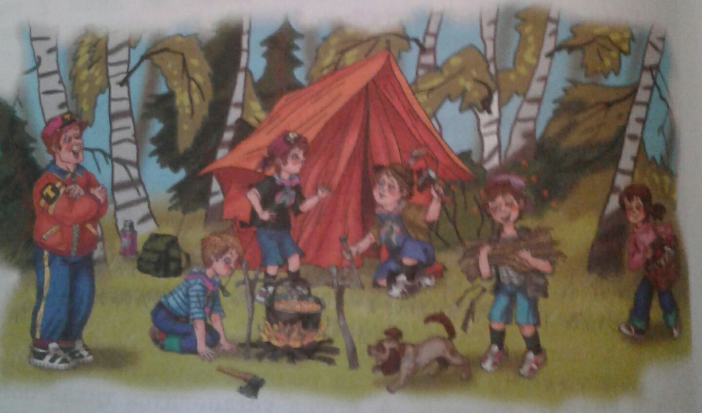 ребята оддыхают на природе, 5 ребят, 1 девочка-4 мальчика, все ребята занимаются своими делами за ними присматривает дядя