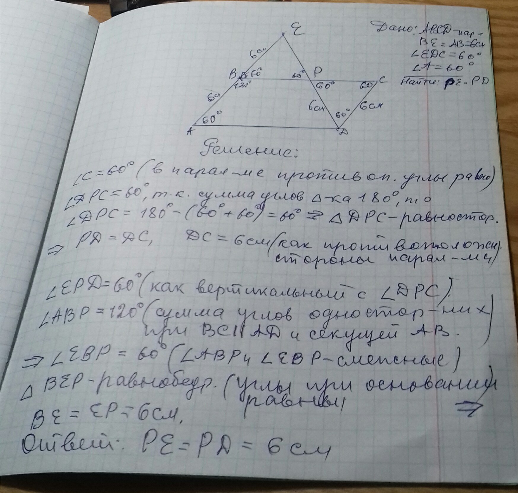 ABCD параллелограмм .угол A=60 градусов.Точка E принадлежит прямой AB (на луче,дополнительном лучу BA) и BE=AB=6см.угол EDC=60 градусов. ED пересекает BC в точке P. Найдите PE и PD.