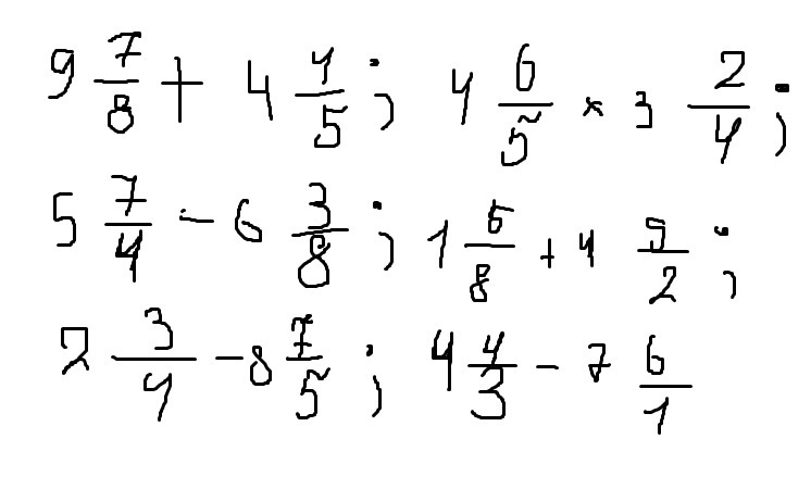 Девять целых семь восьмых плюс четыре целых четыре пятых.,четыре целых шесть пятых умножить на три целых две четвёртых.,пять целых семь четвертых минус шесть целых три восьмых.,одна целая шесть восьмых плюс четыре целых девять вторых.,две целых три четвёртых минус восемь целых семь пятых.,четыре целых четыре третих минус семь целых шесть первых