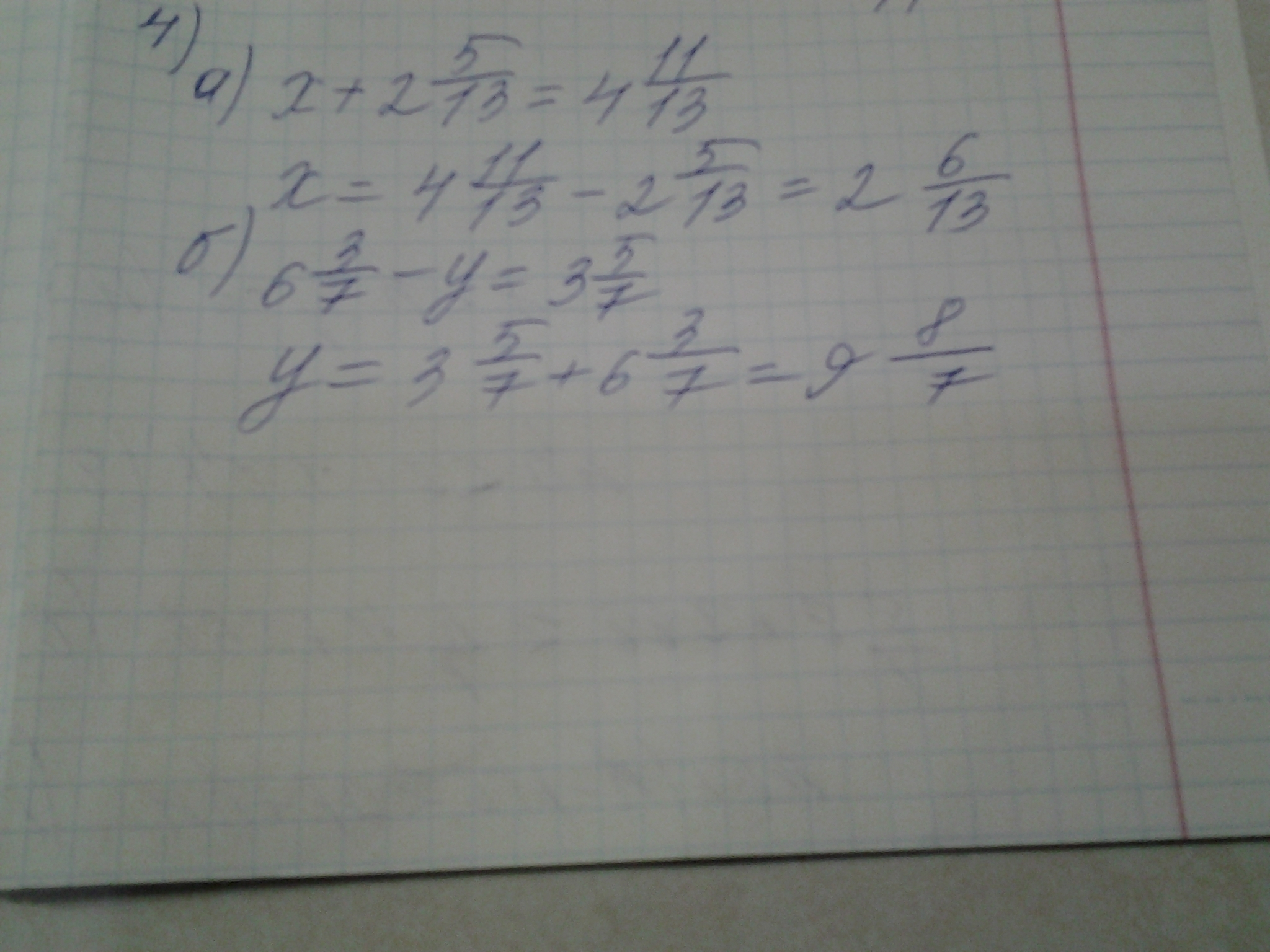 1)х=4 11/13-2 5/13=2целых 6/13. Х=2целых 6/13. 2)у=6 3/7-3 5/7. У=2целых 5/7