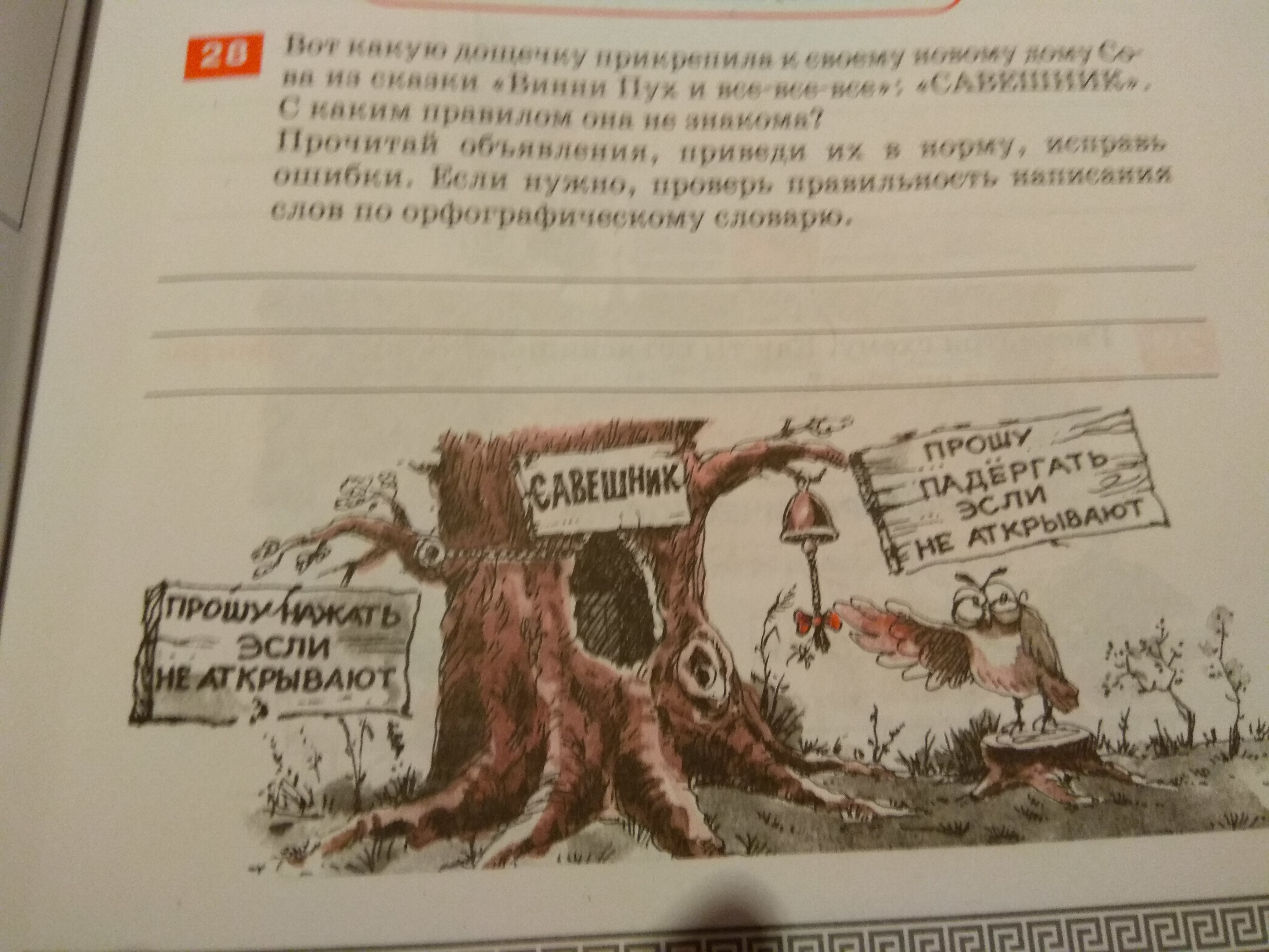 Вот какую дощечку прикрепила к своему новому дому Сова из сказки Винни пух и все все все савешник.С каким правилом она не знакома? Прочитай объявления, приведи их в норму, исправь ошибки. Если нужно, проверь правильность написания слов по орфографическому словарю. Помоги плиз. Заранее спс.