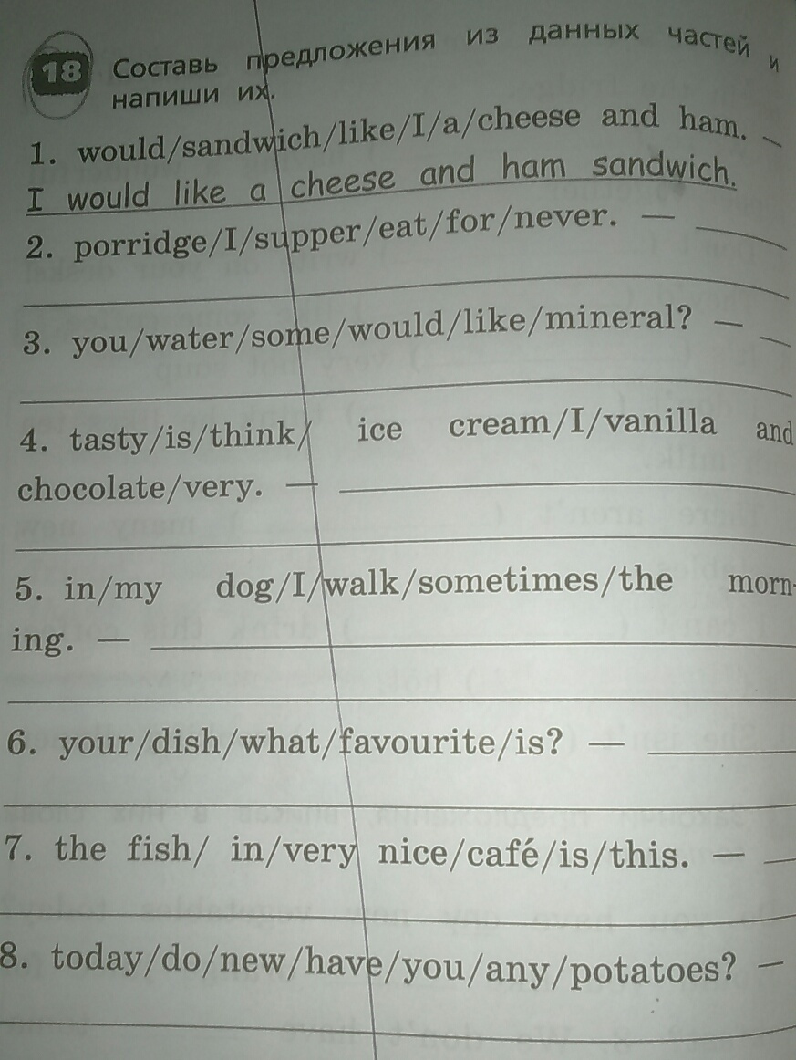 2. I never eat porridge for supper. (Я никогда не ем кашу на ужин).3. Would you like some mineral water?( Ты хочешь минеральной воды?)4. I think vanilla and chocolate ice cream is very tasty.(Я думаю, ванильное и шоколадное мороженое очень вкусное).5. I sometimes walk my dog in the morning.(Я иногда выгуливаю свою собаку утром).6. What is your favourite dish? (Какое ваше любимое блюдо?)7. The fish is very nice in this cafe.(Рыба очень хороша в этом кафе(вкусная)).8. Do you have any potatoes today?(У вас есть картофель сегодня?)