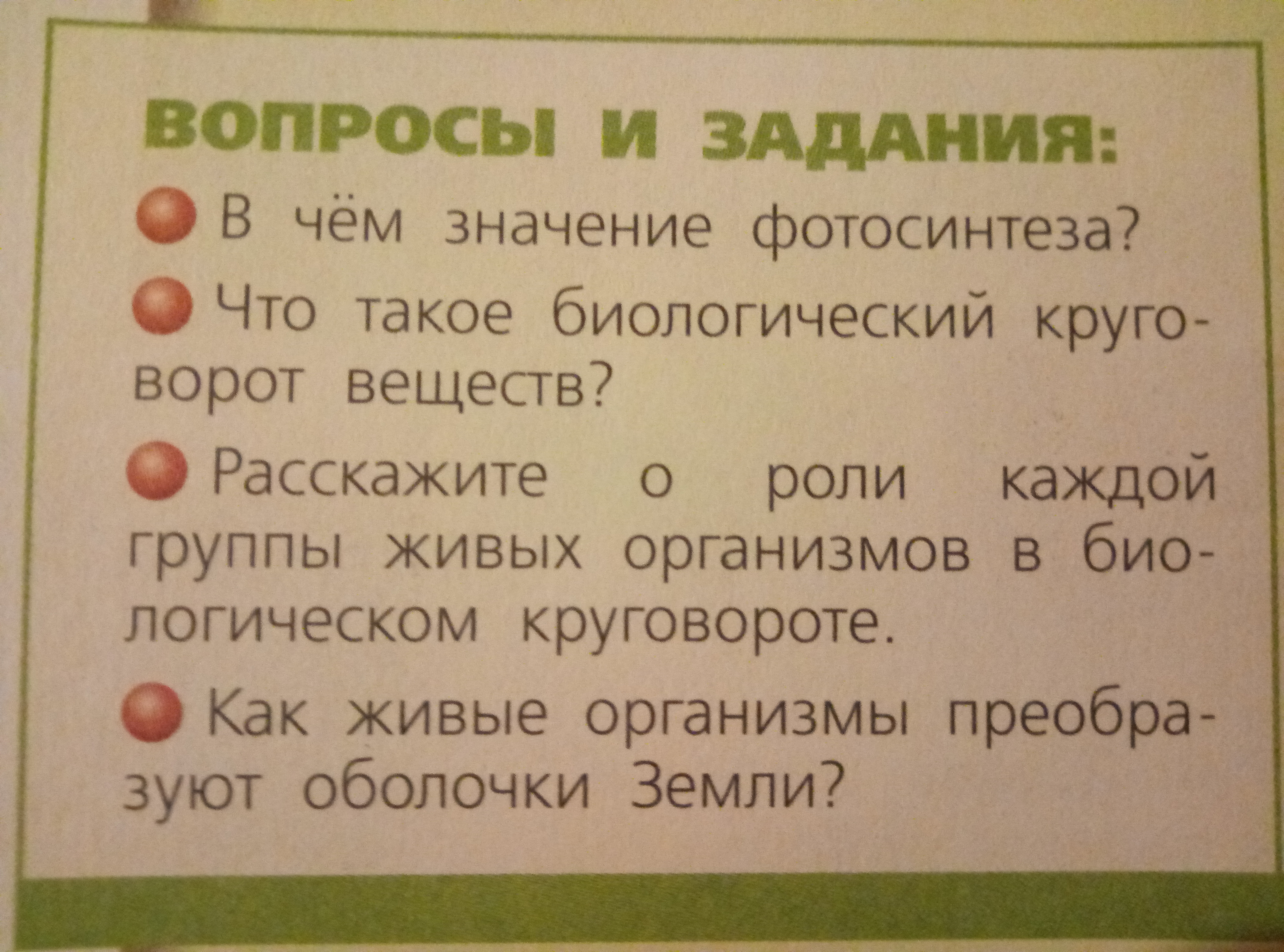 Фотосинтез – единственный процесс в биосфере, ведущий к увеличению ее свободной энергии за счет внешнего источника. Запасенная в продуктах фотосинтеза энергия – основной источник энергии для человечества. Ежегодно в результате фотосинтеза на Земле образуется 150 млрд. тонн органического вещества и выделяется около 200 млн. тонн свободного кислорода. Круговорот кислорода, углерода и других элементов, вовлекаемых в фотосинтез, поддерживает современный состав атмосферы, необходимый для жизни на Земле. Фотосинтез препятствует увеличению концентрации СО2, предотвращая перегрев Земли вследствие так называемого «парникового эффекта».