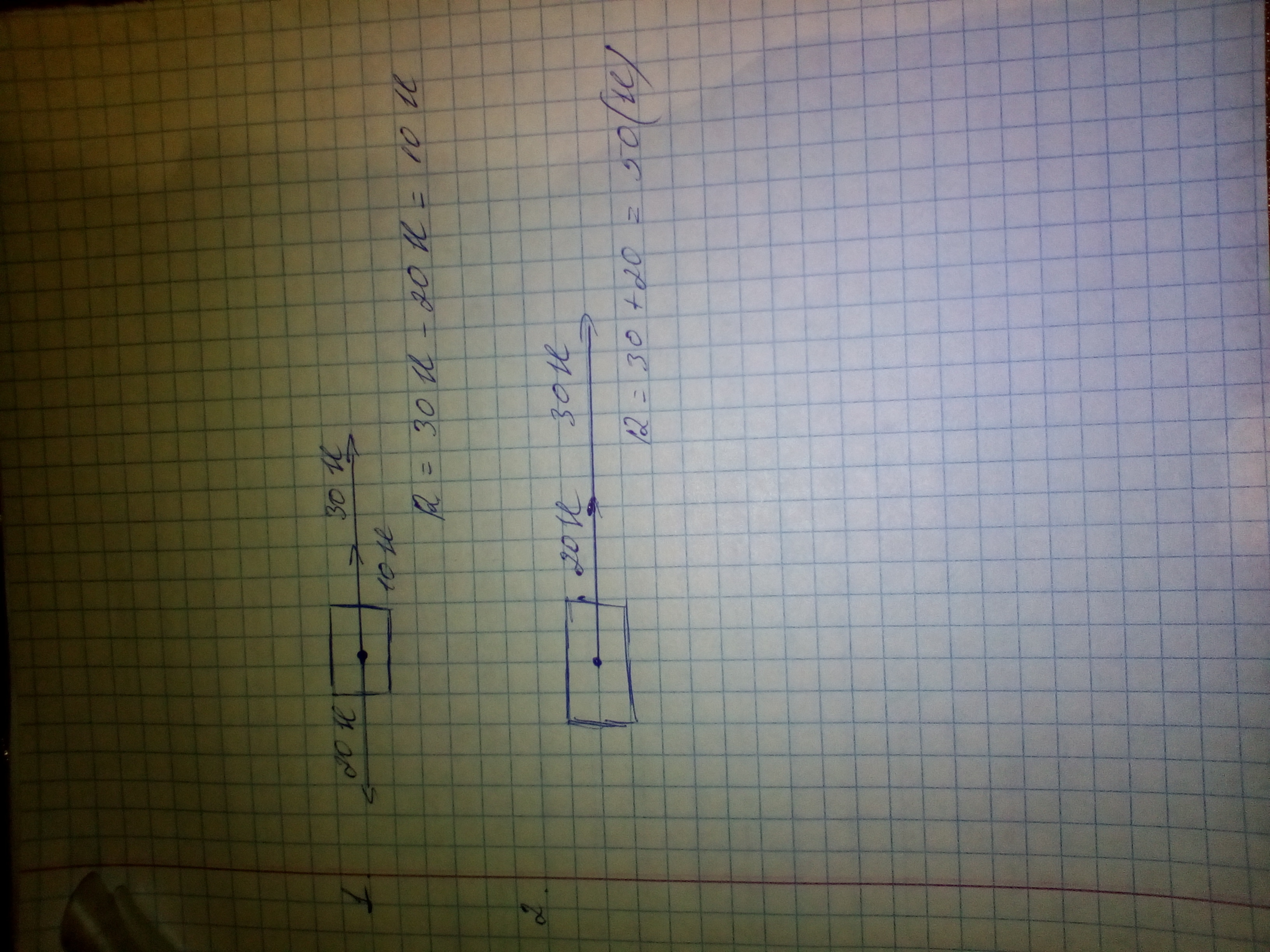 1- на тело действуют две силы -20н и 30н. изобразите эти силы. сколько вариантов рисунка вы можете сделать? чему равна равнодействующая этих сил?