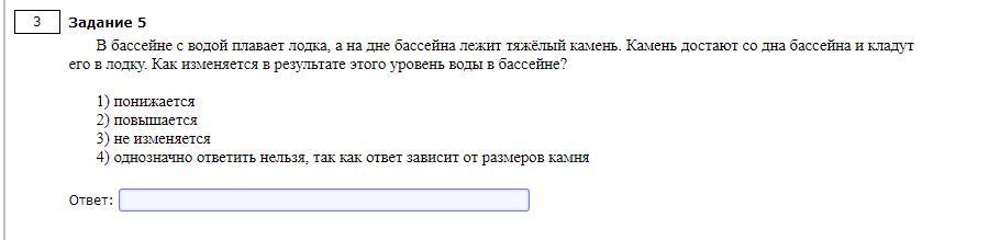 Уровень воды понизится, потому что плотность камня больше, чем плотность воды