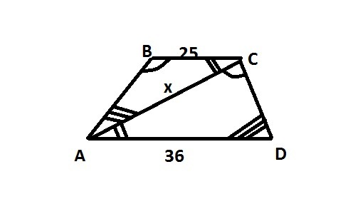 Основания трапеции равны 36 мм и 25 мм. Одна из диагоналей разбивает эту трапецию на два подобных треугольника. Какова длина этой диагонали?