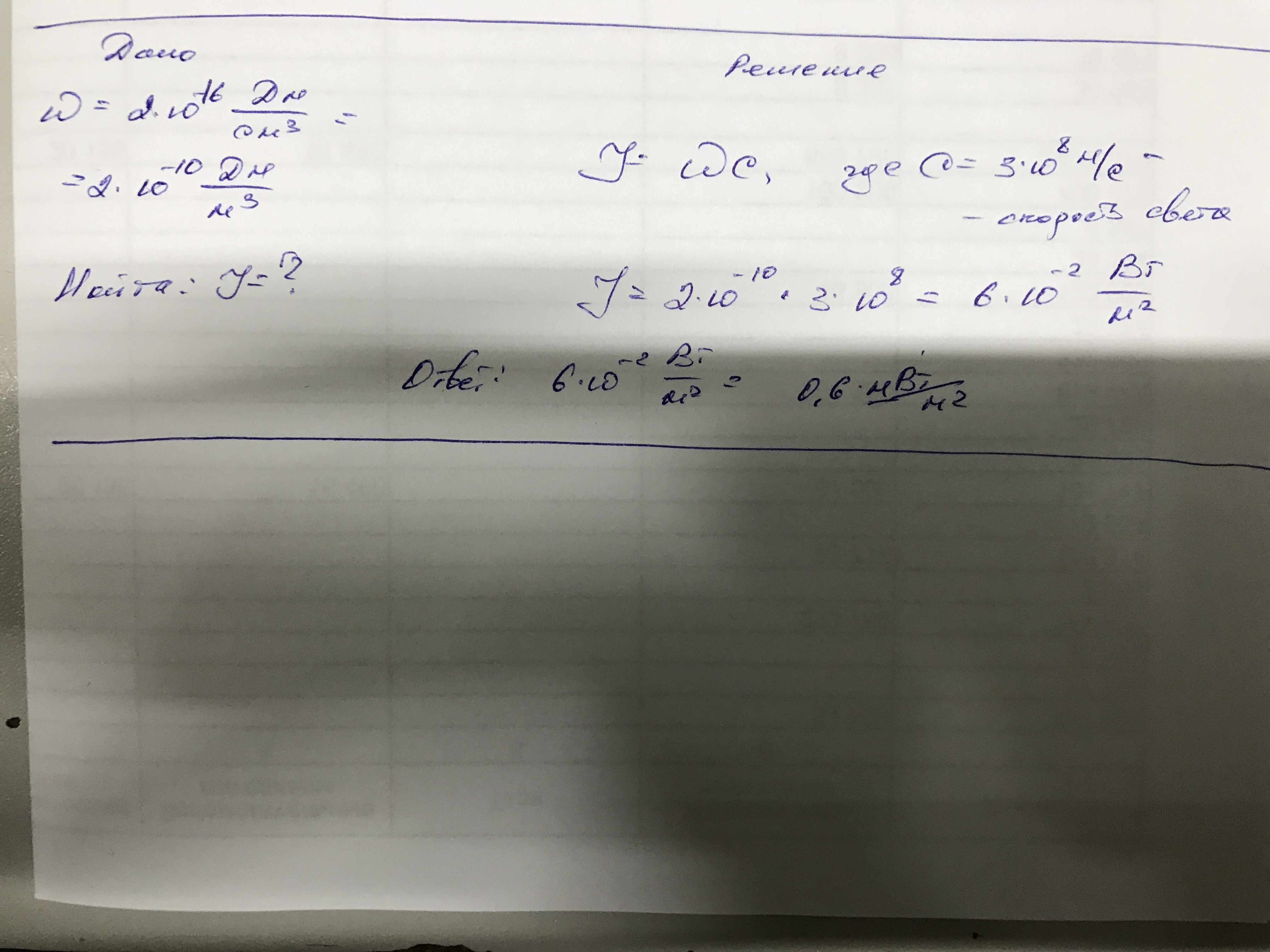 Обьемная плотность энергии электромагнитной волны 2*10/-16 Дж/См3 Найдите плотность потока излучения