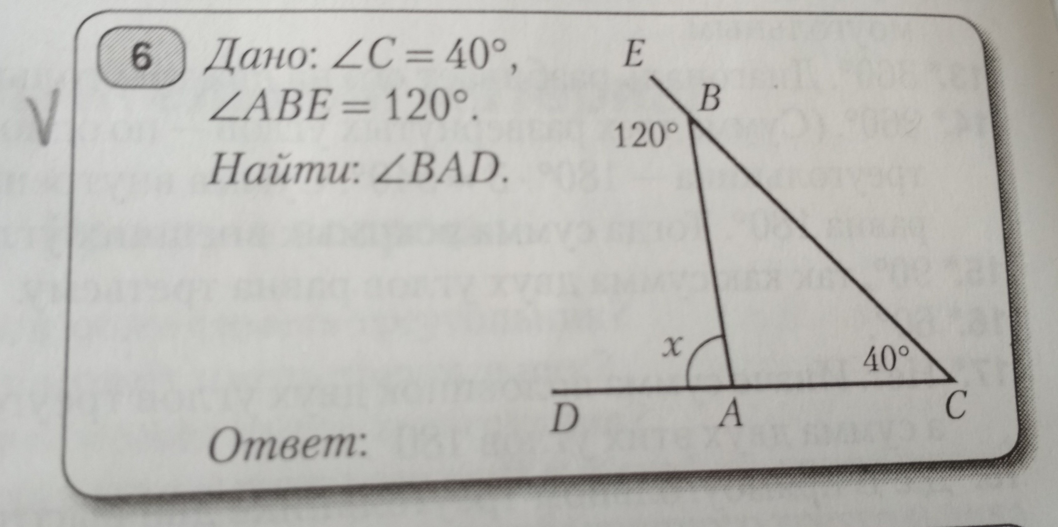 Там получается, что угол ЕВА смежен с углом ВАС = 180-120=60. (угол ВАС). Тогда угол ВАС равен 180-(60+40)=80 (т.к. сумма углов в треугольнике равна 180°) . А угол ВАС смежен с углом ВАД = 180-80=100.