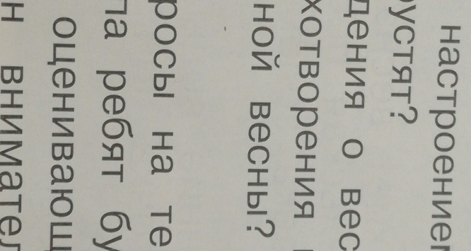 вопросы и задания 2класс.1) какое картины вёсны наблюдаюи поэтыА.Фет и А.Брато?С каким настроением говорят о них? Радуются они или грустят?2)сравни произведения о весне, которые ты прочитал.Все ли стихотворения передают радость от прихода долгожданной весны? Одинаково ли поэты изображают весну?3) Продумайте вопросы на тему Стихи о весне, которые одна группа ребят будет задавать другой.Выберите ученика, оценивающего ваши вопросы и ответы.Он должен внимательно следить, чтобы ребята не отступали от темы.пожалуйста как правильно ответить?