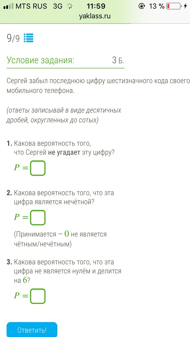 P=(не угадает правильную цифру) =1−1/10=9/10=0,9