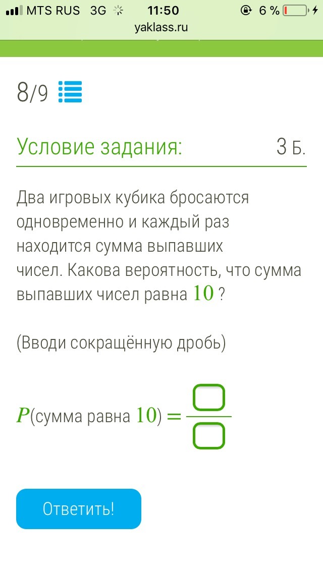 сумма равная 10 может быть : 5 + 5 , 4 + 6 и 6 + 4, т.е. вариантов у нас три, тогда: 3/36 = 0,083 вероятность того, что выпадет сумма = 10