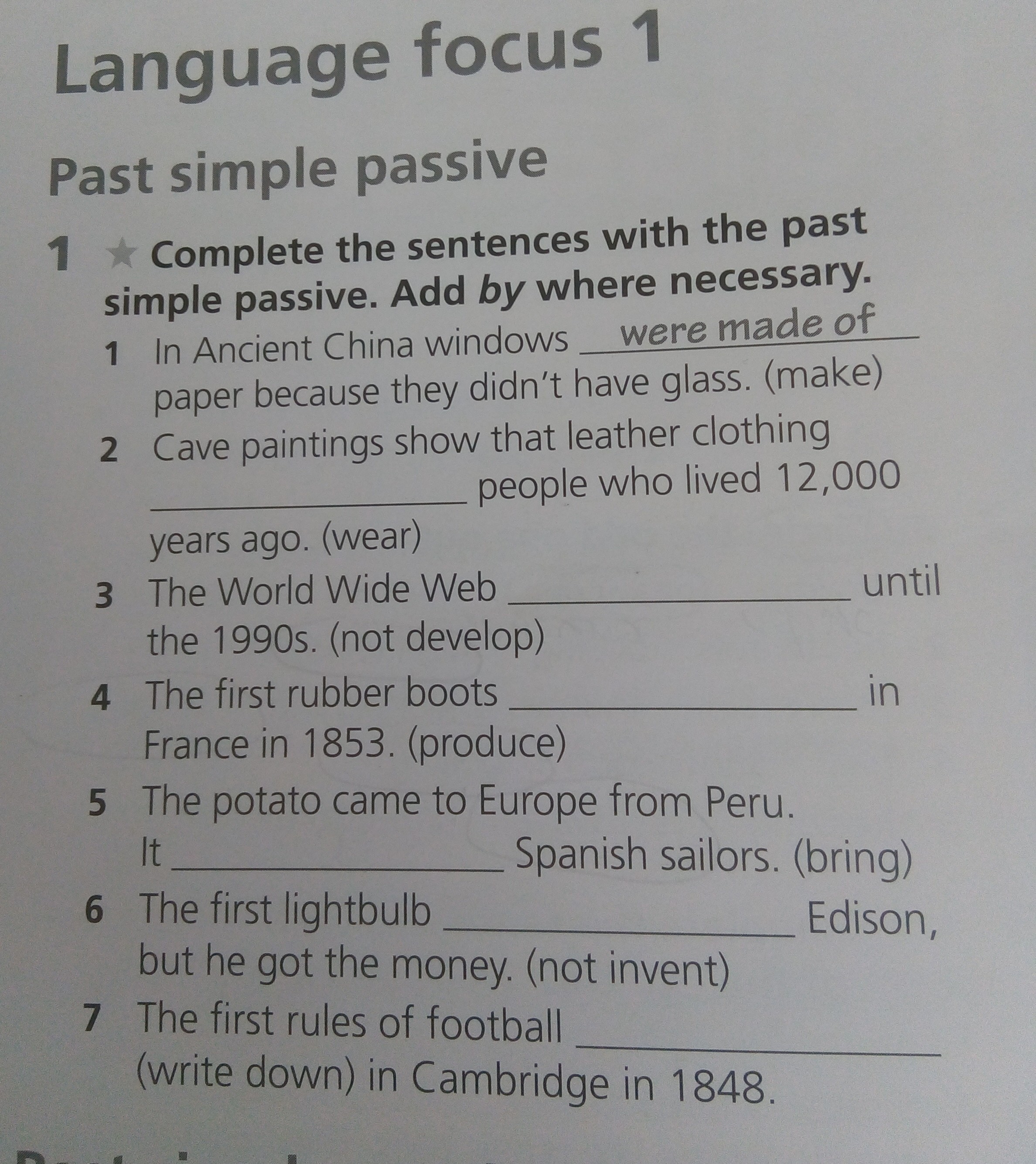 2. Were worn by 3. Wasn’t developed 4. Were produced. 5. Was brought. 6. Was not invented. 7. Were Witten down.