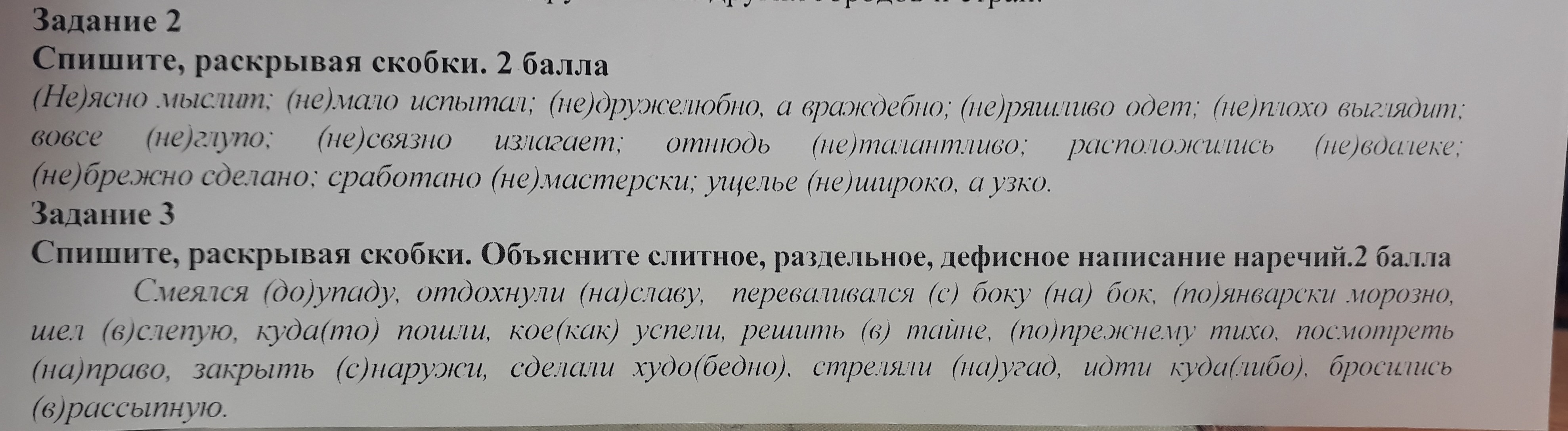 Неясно мыслит; немало испытал; не дружелюбно, а враждебно; неряшливо одет; неплохо выглядит; вовсе не глупо; несвязно излагает; отнюдь не талантливо; расположились невдалеке; небрежно сделано; сработано не мастерски; ущелье не широко, а узко;