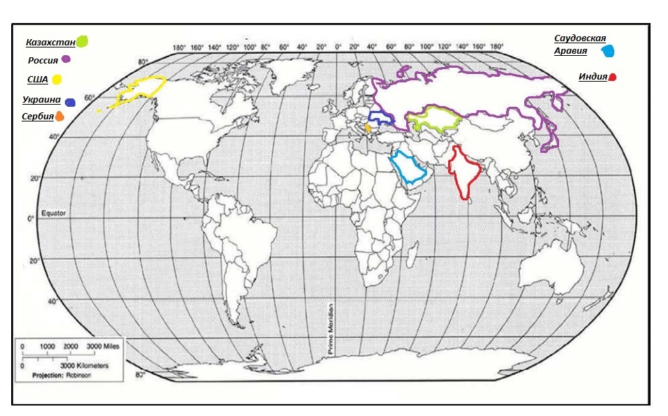 Где находится Саудовская Аравия,Индия,Сербия,Украина,Казахстан,Россия,США на контурной карте.(градусы можно сказать)