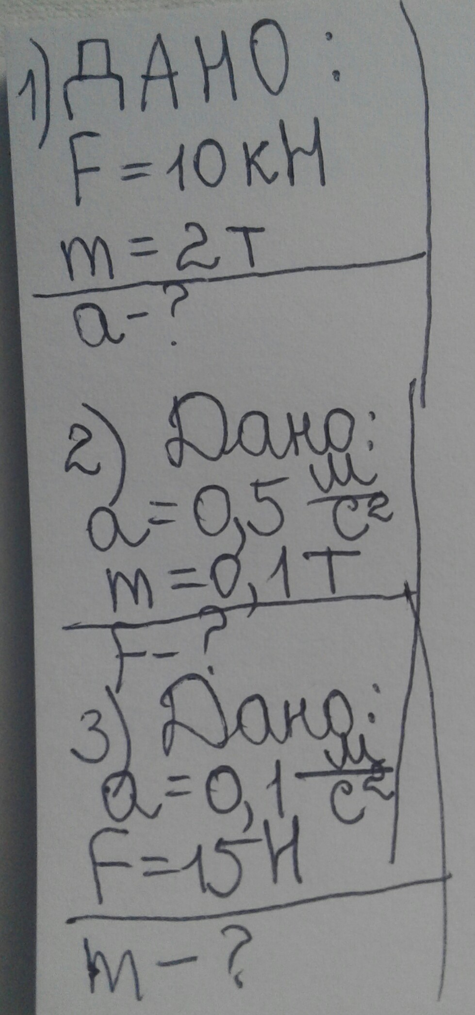 F=ma второй закон Ньютона 1.F =10000H m =2000kg a=F/m a=5м/с2