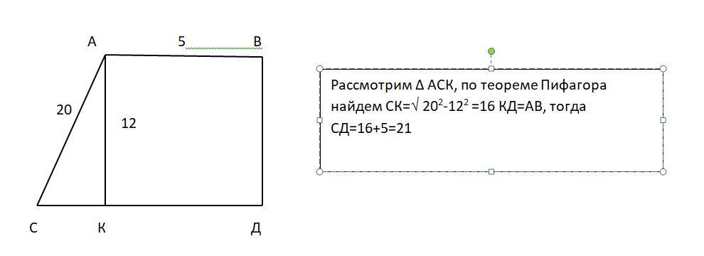 Очень срочно.В прямоугольной трапеции высота равна 12, большая боковая сторона равна 20, меньшее основание равно 5. Найти большее основание.