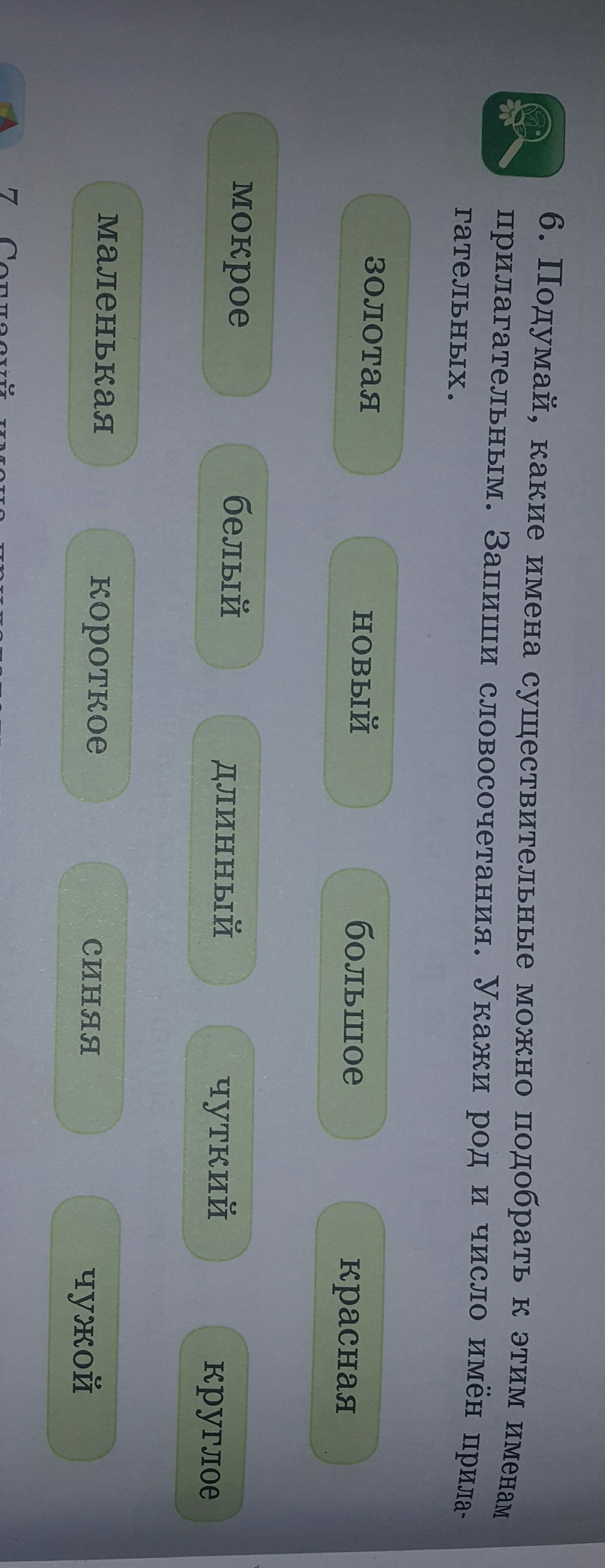 золотя чаша (ж.р. ед.ч.), новый телфон(м.р., ед.ч.), большое счастье(ср.р., ед.ч.), красная клубника (ж.р, ед.ч) мокрое полотенце (ж.р, ед.ч), белый снег (м.р., ед.ч), длинный нос (м.р, ед.ч), чуткий нюх(м.р, ед.ч), круглое солнце (ср.р,ед.ч), маленькая девочка(ж.р,ед.ч), короткое предложение(ср.р, ед.ч), синяя вода(ж.р,ед.ч), чужой человек(м.р , ед.ч)