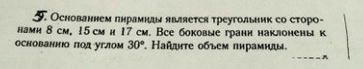 Все боковые грани наклонены к основанию под углом 30°, это означает, что высота пирамиды из вершины опускается в центр окружности, вписанной в основание: