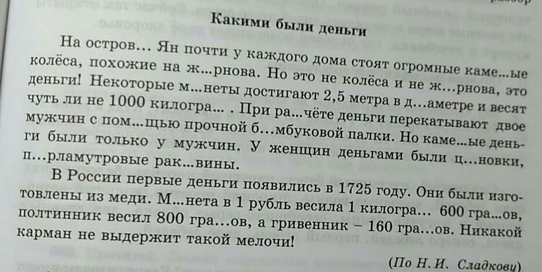 На острове Ян почти у каждого дома стоят огромные каменные колеса, похожие на жернова. Но это не колеса и не жернова, это ...деньги! Некоторые монеты достигают двух целых пяти десятых КОЛИЧ. ДРОБ .метра в диаметре и весят чуть ли не тысячу КОЛИЧ. килограммов. При расчете деньги перекатывают двое КОЛИЧ. мужчин с помощью прочной бамбуковой палки. Но каменные деньги были только у мужчин. У женщин были циновки, перламутровые раковины.