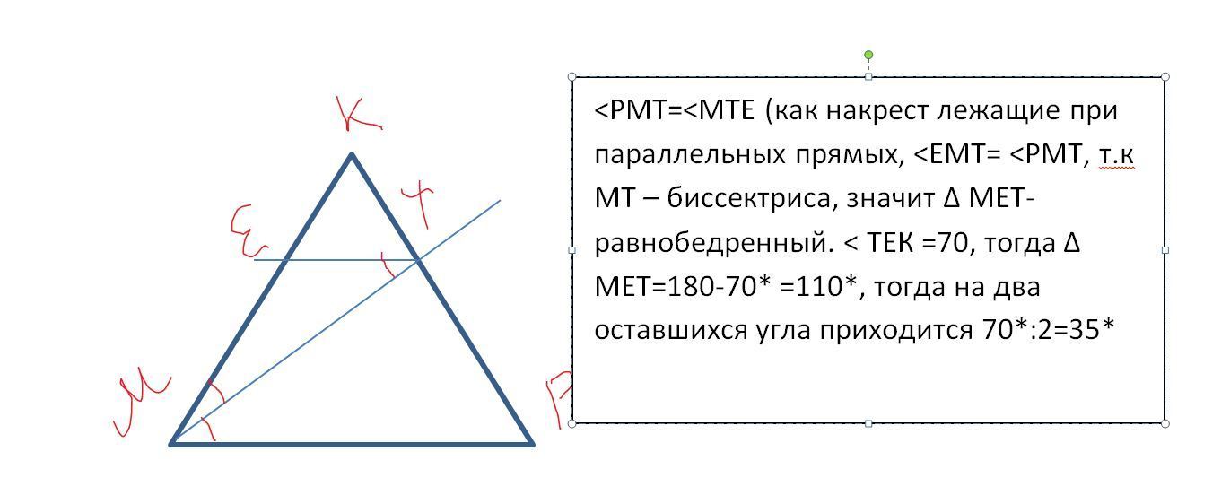 Отрезок МТ биссектриса треугольника MPK Через точку Т проведена прямая,параллельная стороне MP и пересекающая сторону MK в точке E. Вычислите градусные меры углов треугольника MTE,если угол TEK=70