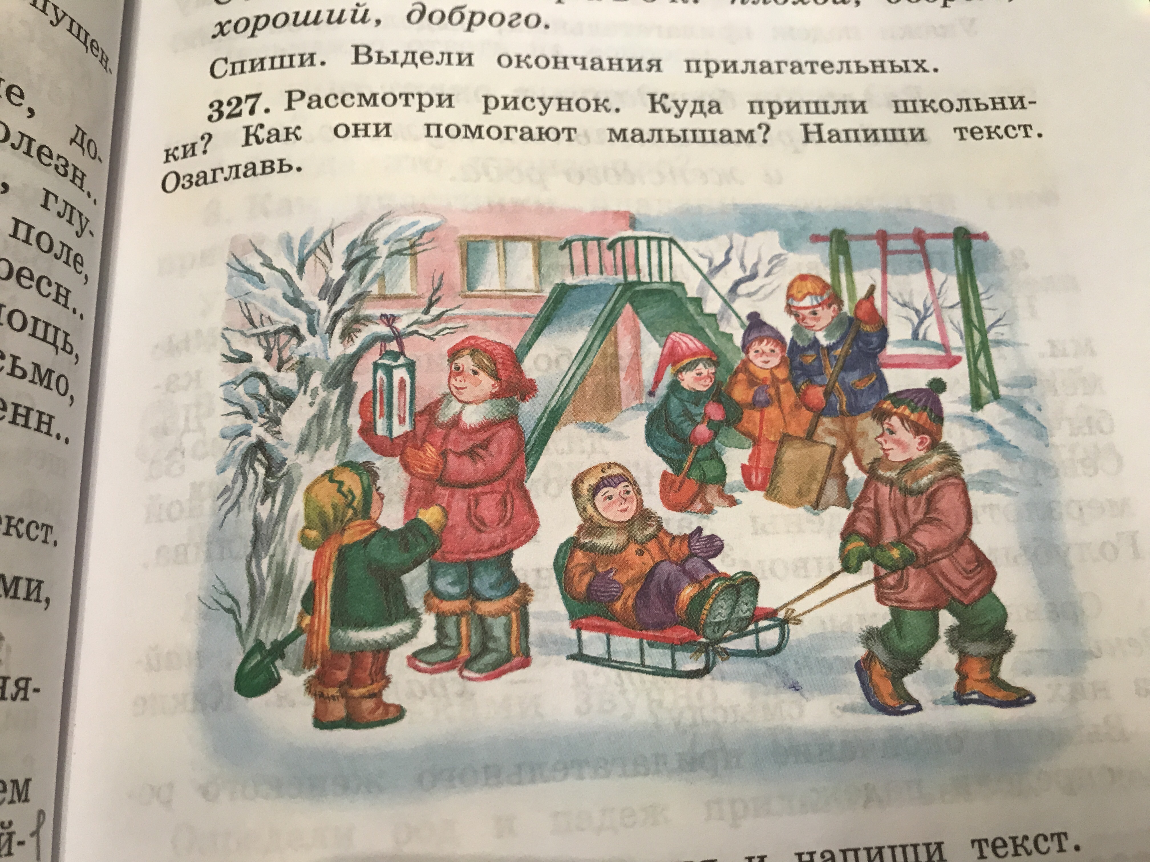 детвора вышла на улицу в первий день снега.Дэвочки вэшают кормушку для птичекё штоби они емели кушать.Ребята убырают снегюМальчики катаютца на саняхё