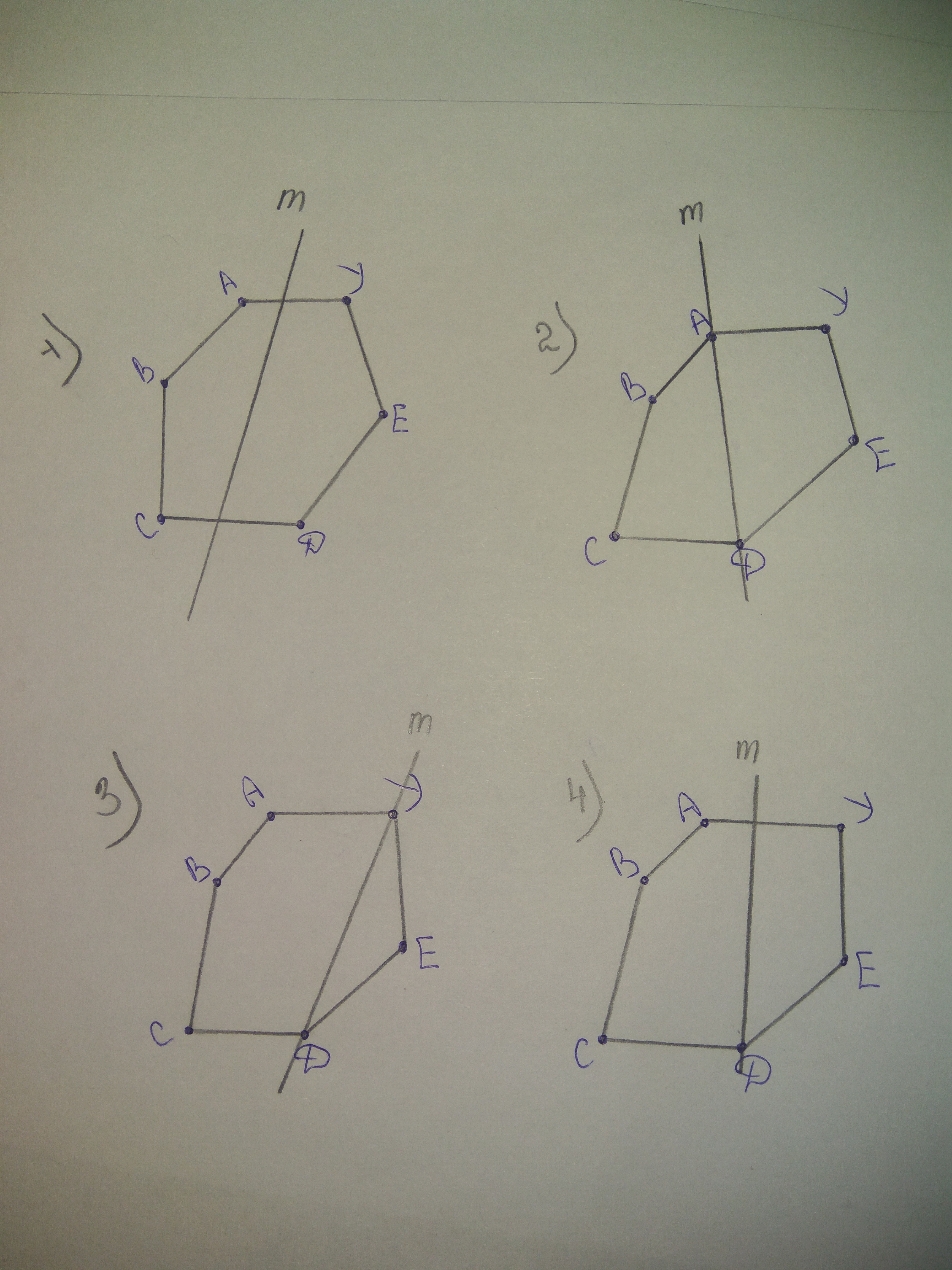 Построй 4 шестиугольника.Проведи прямую m так,чтобы она разбила шестиугольник:
