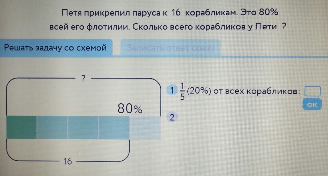 Получается, что 80% - это 4/5 корабликов, значит всего их было 20, т.к 4/5 - это 80%. Следовательно, 1/5 - это 20/5=4 кораблика