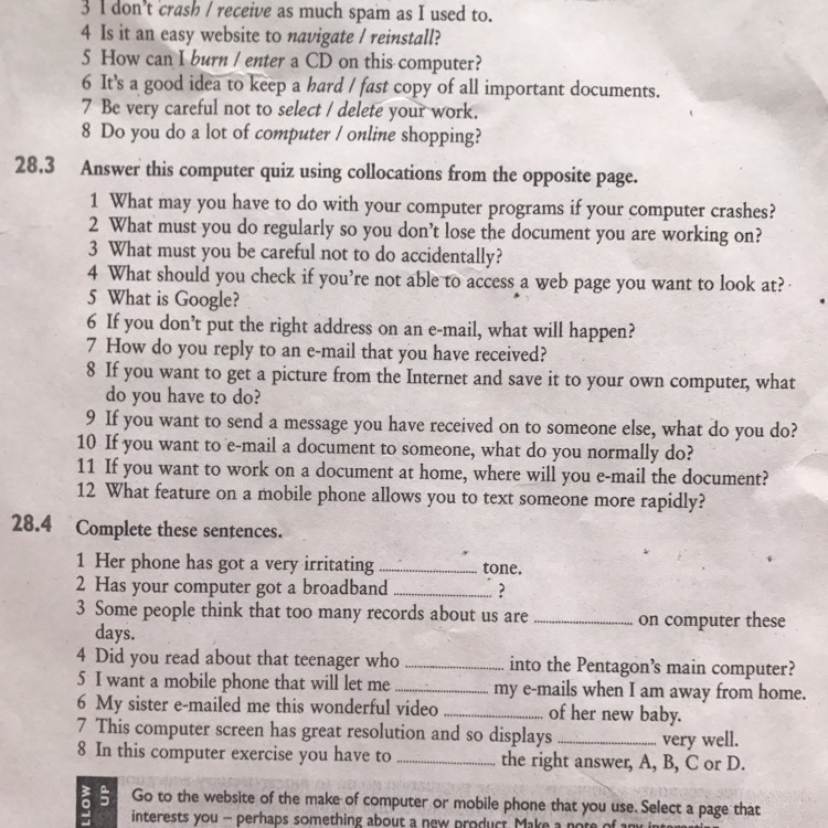 28.3 Ответьте на эту компьютерную викторину, используя совпадения с противоположной страницы. 1 Что может быть связано с компьютерными сбоями компьютера? 2, вы должны регулярно делать это, чтобы не потерять документ, над которым работаете? 3 Что вы должны быть осторожны, чтобы не делать 4 шляпы, если вы проверяете, не можете ли вы получить доступ к веб-странице, на которую хотите посмотреть? 5 Что такое ? 6 Если вы не поместите правильный адрес по электронной почте, что произойдет? 7 Как вы отвечаете на полученное электронное письмо? хотите ли вы получить снимок из Интернета и сохранить его на свой компьютер, что вы должны сделать? 9 Если вы хотите отправить сообщение, которое вы получили в, что вы делаете? 10 Если вы хотите отправить кому-то документ по электронной почте, что вы обычно делаете?