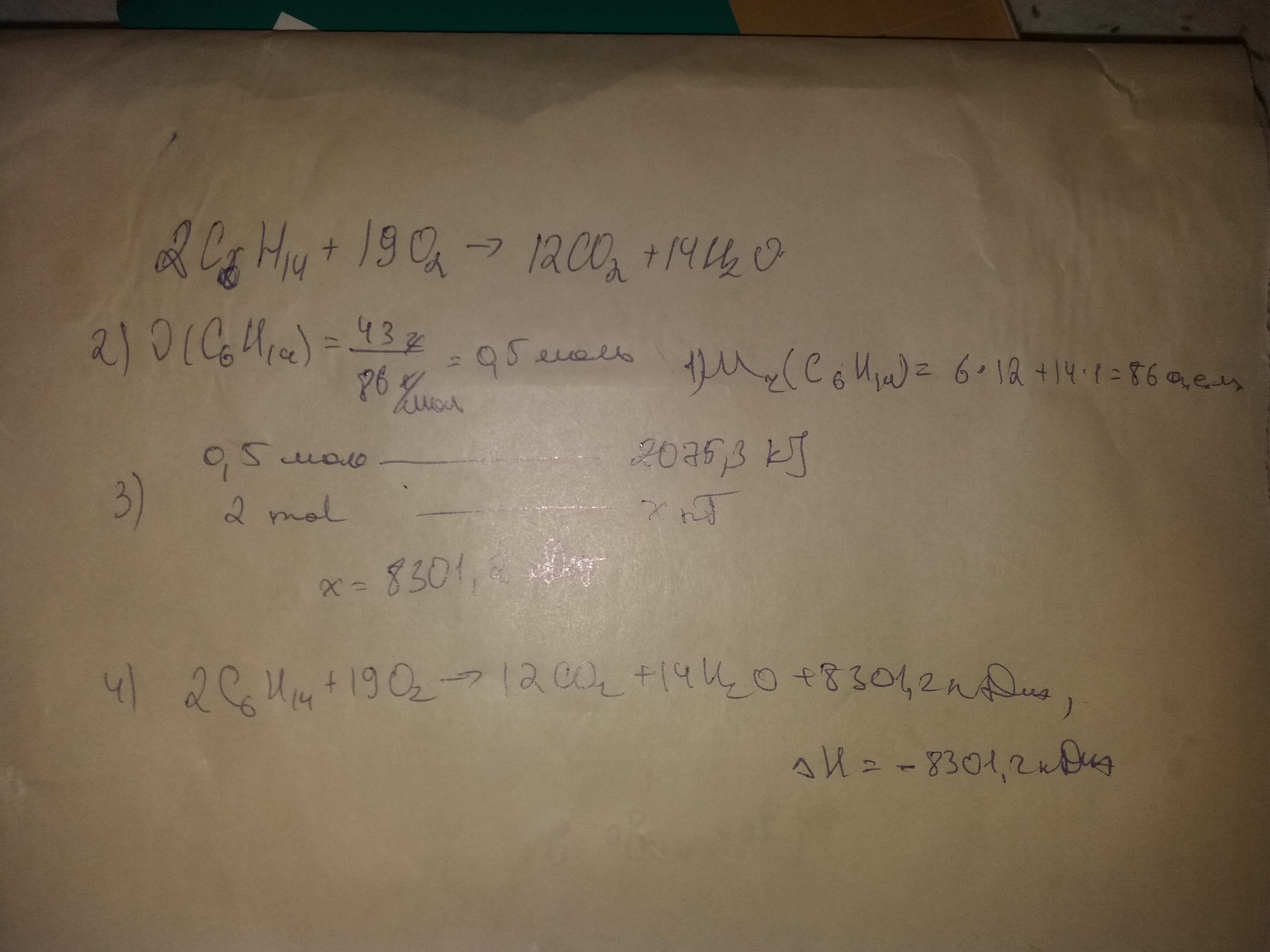 3)Вычисли количество тепла выделенное при сожжении 2 молей гексана.