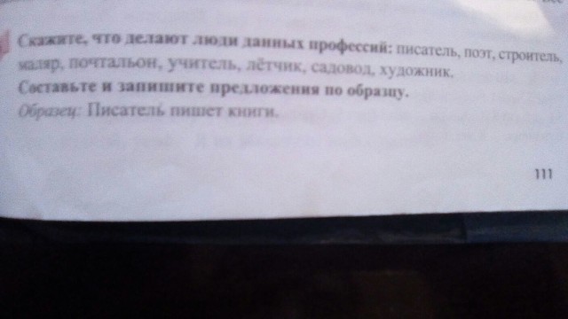 Писатель пишет книги. Поэт сочиняет стихи. Строитель строит здания. Маляр занимается окраской зданий. Почтальон разносит почту. Учитель учит детей. Летчик управляет самолетом. Садовод ухаживает за растениями. Художник рисует картины.