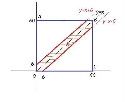 Обозначим за x и y время прихода, 0≤x,y≤60 (минут), так как время ожидания с 13.00 до 14.00 равно 60 мин. В прямоугольной системе координат этому условию удовлетворяют точки, лежащие внутри квадрата OABC. Друзья встретятся, если между моментами их прихода пройдет не более 6 минут, то есть