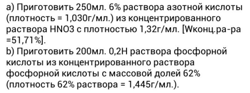 В) в 200 миллилитрах содержится 200*0,2*32,7/1000=1,31 грамм фосфорной кислоты. 1,31 грамм составляет 62%, а Х грамм раствора составляет 100%. Х=1,31*100/62=2,12 грамм концентрированного раствора фосфорной кислоты требуется взять, что соответствует 1,47 миллилитров и добавить 200-1,47=198,53 миллилитров воды