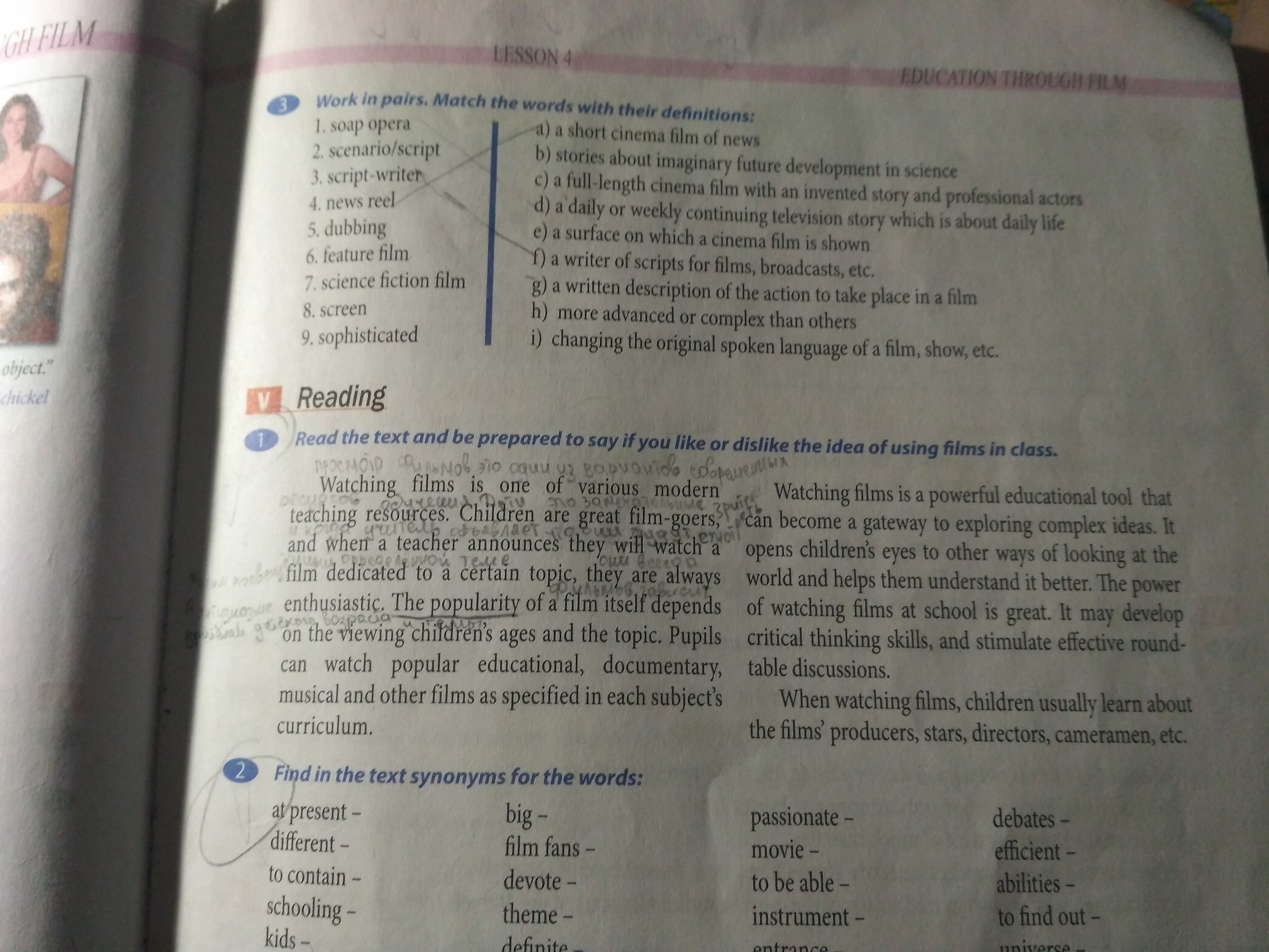Просмотр фильмов - один из современных учебных ресурсов. Дети большие любители фильмов и когда учитель объявляет, что они будут смотреть фильм посвященный определенной теме они всегда воспринимают это с восторгом. Популярность самого фильма зависит от возраста смотрящих детей и от темы. Ученики могут смотреть популярный образовательные, документальные, музыкальные и другие фильмы в соответствии с темами учебного плана. Просмотр фильмов- мощный образовательный инструмент, который может открыть путь для изучения сложных тем. Он открывают детям глаза на другие возможности увидеть мир и помогает им понять его лучше. Эффект от просмотров фильмов в школе велик. Это может развить навыки критического мышления и стимулировать эффективные дискуссии за круглым столом. При просмотре фильмов дети, как правило, получают информацию о продюсерах фильмов, звездах, режиссерах, операторах и т.д.