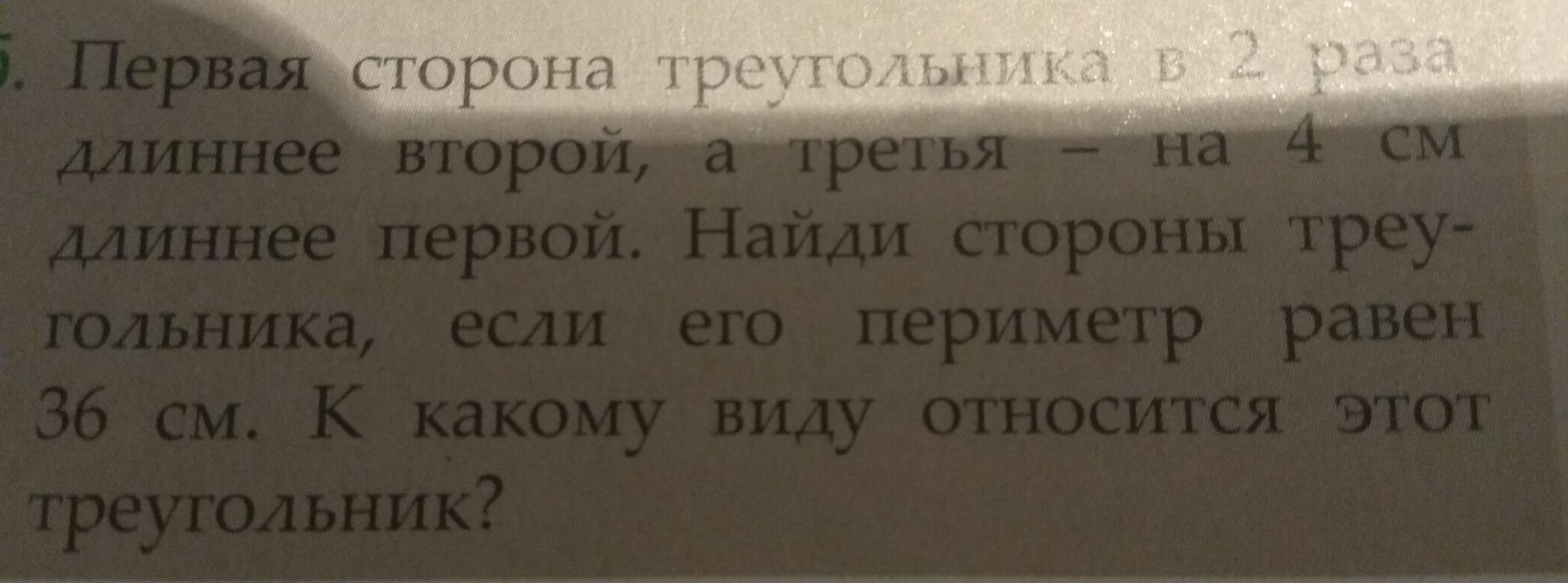 Первая сторона треугольника в 2 раза длиннее второго а третий на 4 см длиннее первой Найди стороны треугольника если его периметр равен 36 см какому виду относится этот треугольник