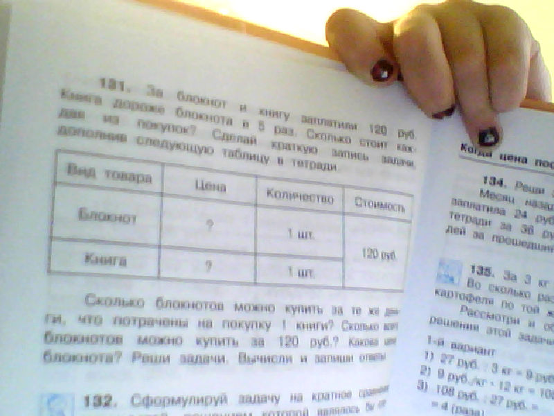 за блокнот и книгу заплатили 120 руб. Причем книга была дароже блокнота в 5 раз. Сколько стоит каждая из покупок? Сделай кратную запись задачи, дополнив следующую таблицу в тетради.