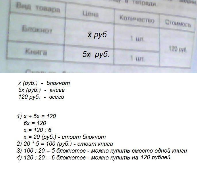 Сколько сколько блокнотов можно купить на те деньги которые были потрачены на книгу? Сколько всего блокнотов можно купить на 120 руб.? Какова цена блокнота? Реши задачи вычисли и запиши ответы.